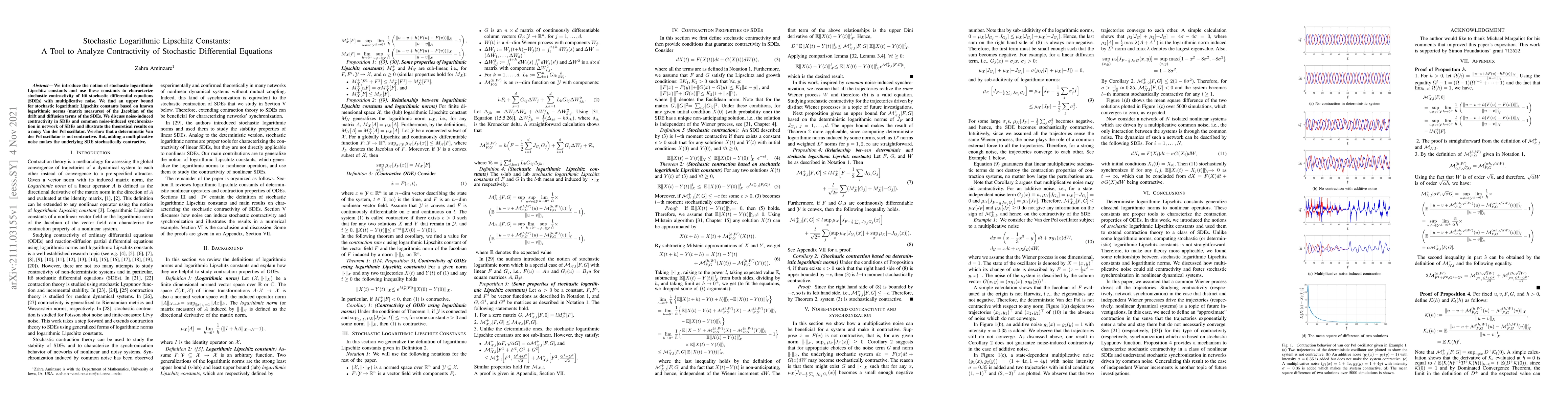 This research introduces stochastic logarithmic Lipschitz constants to analyze the contractivity of stochastic differential equations (SDEs) with multiplicative noise. It provides an upper bound for these constants using logarithmic norms of the Jacobian, demonstrating noise-induced contractivity in SDEs and synchronization in networks. The methodology is illustrated with a noisy Van der Pol oscillator, showing that while a deterministic system isn't contractive, the addition of noise makes the SDE stochastically contractive.