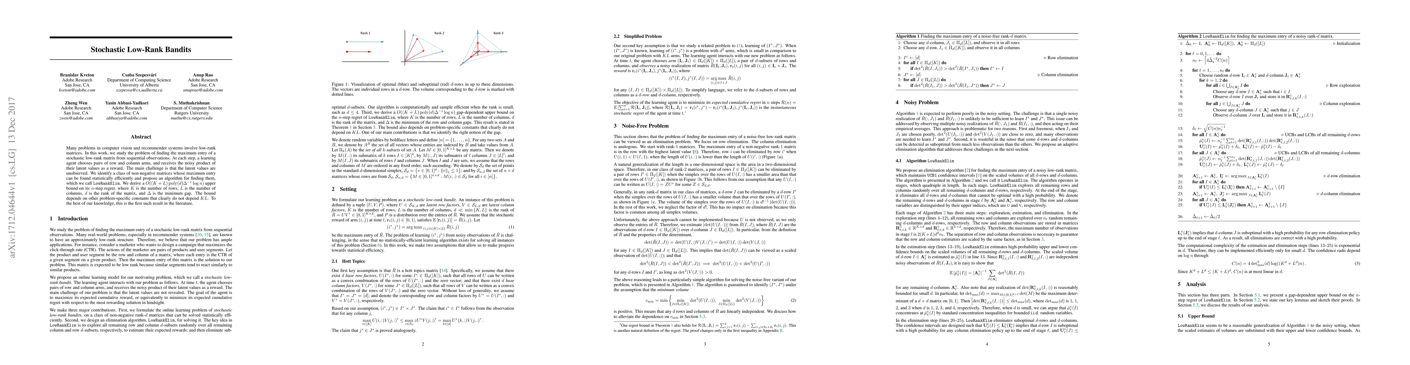 Many problems in computer vision and recommender systems involve low-rank matrices. In this work, we study the problem of finding the maximum entry of a stochastic low-rank matrix from sequential observations. At each step, a learning agent chooses pairs of row and column arms, and receives the noisy product of their latent values as a reward. The main challenge is that the latent values are unobserved. We identify a class of non-negative matrices whose maximum entry can be found statistically efficiently and propose an algorithm for finding them, which we call LowRankElim. We derive a $\DeclareMathOperator{\poly}{poly} O((K + L) \poly(d) \Delta^{-1} \log n)$ upper bound on its $n$-step regret, where $K$ is the number of rows, $L$ is the number of columns, $d$ is the rank of the matrix, and $\Delta$ is the minimum gap. The bound depends on other problem-specific constants that clearly do not depend $K L$. To the best of our knowledge, this is the first such result in the literature.
