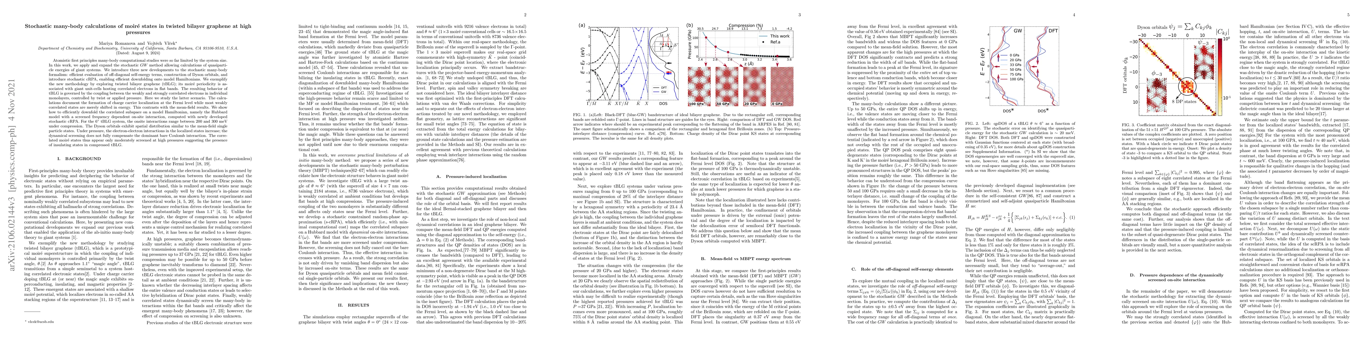 Atomistic first principles many-body computational studies were so far limited by the system size. In this work, we apply and expand the stochastic GW method allowing calculations of quasiparticle energies of giant systems. We introduce three new developments to the stochastic many-body formalism: efficient evaluation of off-diagonal self-energy terms, construction of Dyson orbitals, and introduce stochastic cRPA, enabling efficient downfolding onto model Hamiltonians. We exemplify the new methodology by exploring twisted bilayer graphene (tBLG); its moire periodicity is associated with giant unit-cells hosting correlated electrons in flat bands. The resulting behavior of tBLG is governed by the coupling between the weakly and strongly correlated electrons in individual monolayers, controlled by twist or applied pressure. Here we study the latter scenario. The calculations document the formation of charge carrier localization at the Fermi level while most weakly correlated states are merely shifted in energy. This contrasts with the mean-field results. We show how to efficiently downfold the correlated subspace on a model Hamiltonian, namely the Hubbard model with a screened frequency dependent on-site interaction, computed with newly developed stochastic cRPA. For the $6^{\circ}$ tBLG system, the onsite interactions range between 200 and 300 meV under compression. The Dyson orbitals exhibit spatial distribution similar to the mean-field single particle states. Under pressure, the electron-electron interactions in the localized states increase; the dynamical screening does not fully compensate the dominant bare Coulomb interaction. The correlated moir\'e states thus appear only moderately screened at high pressures suggesting the presence of insulating states in compressed tBLG.