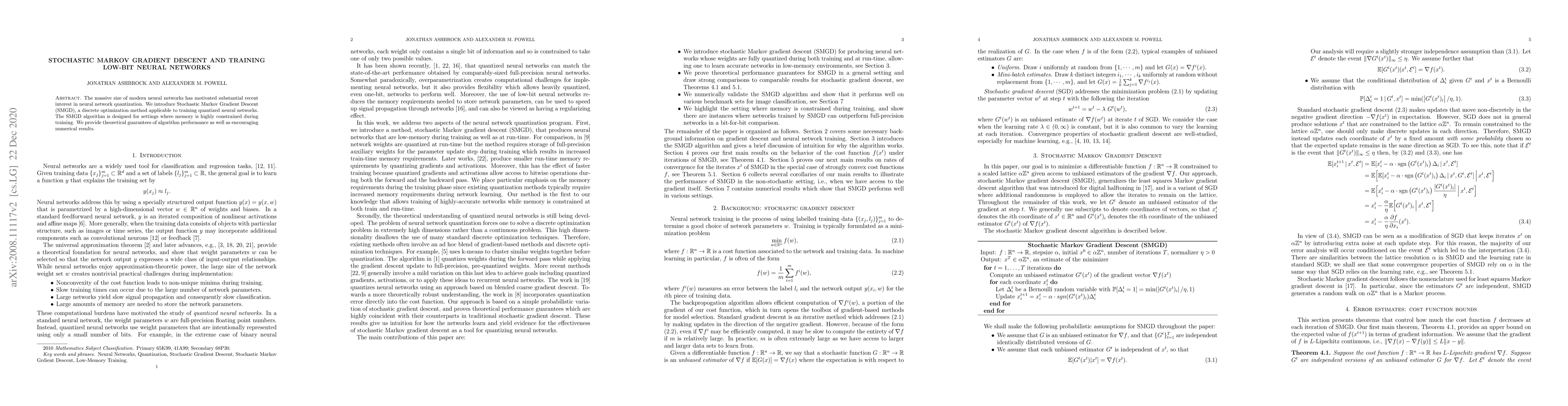 The massive size of modern neural networks has motivated substantial recent interest in neural network quantization. We introduce Stochastic Markov Gradient Descent (SMGD), a discrete optimization method applicable to training quantized neural networks. The SMGD algorithm is designed for settings where memory is highly constrained during training. We provide theoretical guarantees of algorithm performance as well as encouraging numerical results.