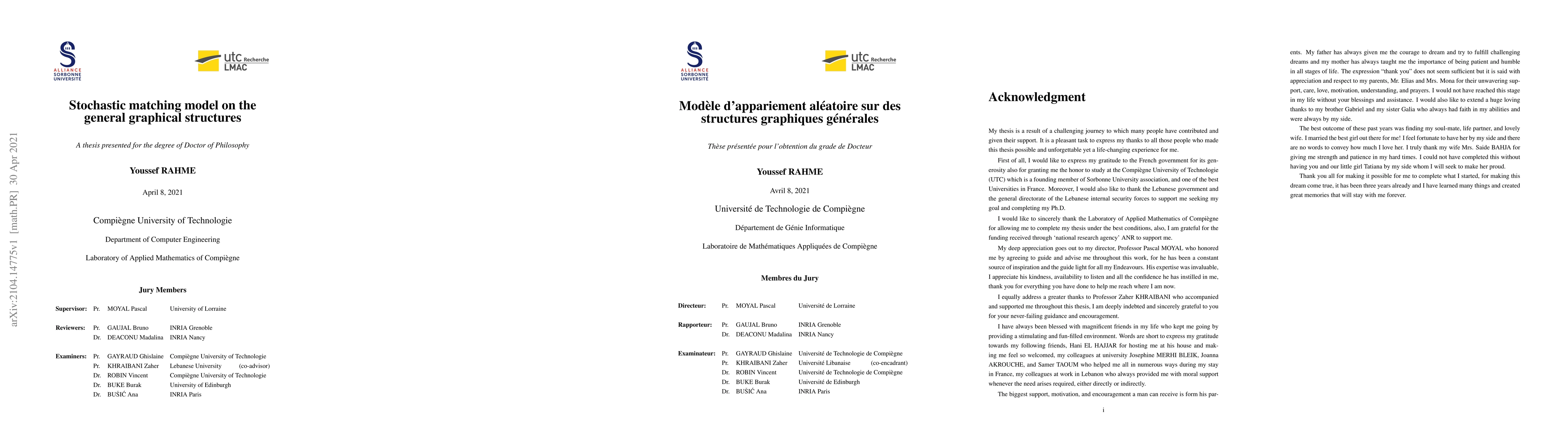 Motivated by a wide range of assemble-to-order systems and systems of the collaborative economy applications, we introduce a stochastic matching model on hypergraphs and multigraphs, extending the model introduced by Mairesse and Moyal 2016. In this thesis, the stochastic matching model $(\mathbb{S},\Phi,\mu)$ on general graph structures are defined as follows: given a compatibility general graph structure $\mathbb{S}=(\mathcal{V},\mathcal{S})$ which of a set of nodes denoted by $\mathcal{V}$ that represent the classes of items and by a set of edges denoted by $\mathcal{S}$ that allows matching between different classes of items. Items arrive at the system at a random time, by a sequence (assumed to be $i.i.d.$) that consists of different classes of $\mathcal{V}$, and request to be matched due to their compatibility according to $\mathbb{S}$. The compatibility by groups of two or more (hypergraphical cases) and by groups of two with possibilities of matching between the items of the same classes (multigraphical cases). The unmatched items are stored in the system and wait for a future compatible item and as soon as they are matched they leave it together. Upon arrival, an item may find several possible matches, the items that leave the system depend on a matching policy $\Phi$ to be specified. We study the stability of the stochastic matching model on hypergraphs, for different hypergraphical topologies. Then, the stability of the stochastic matching model on multigraphs using the maximal subgraph and minimal blow-up to distinguish the zone of stability.