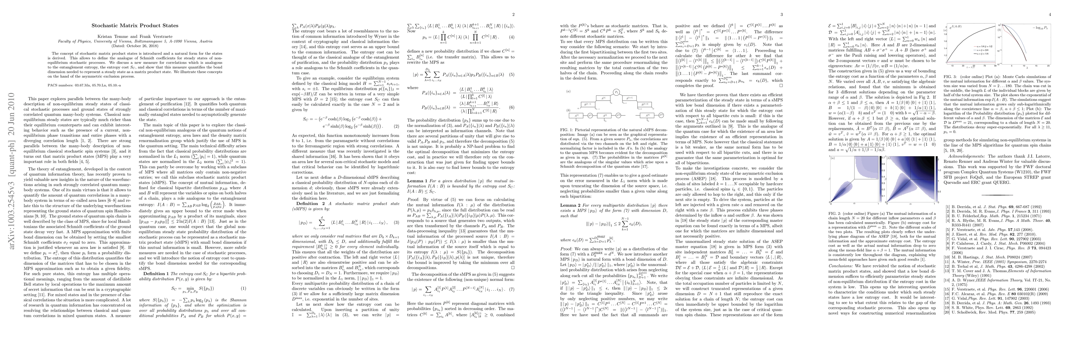 The paper introduces stochastic matrix product states and derives a natural form for these states, defining Schmidt coefficients for non-equilibrium stochastic processes. It proposes a new measure, entropy cost $S_C$, analogous to entanglement entropy, to quantify the bond dimension required to represent steady states.