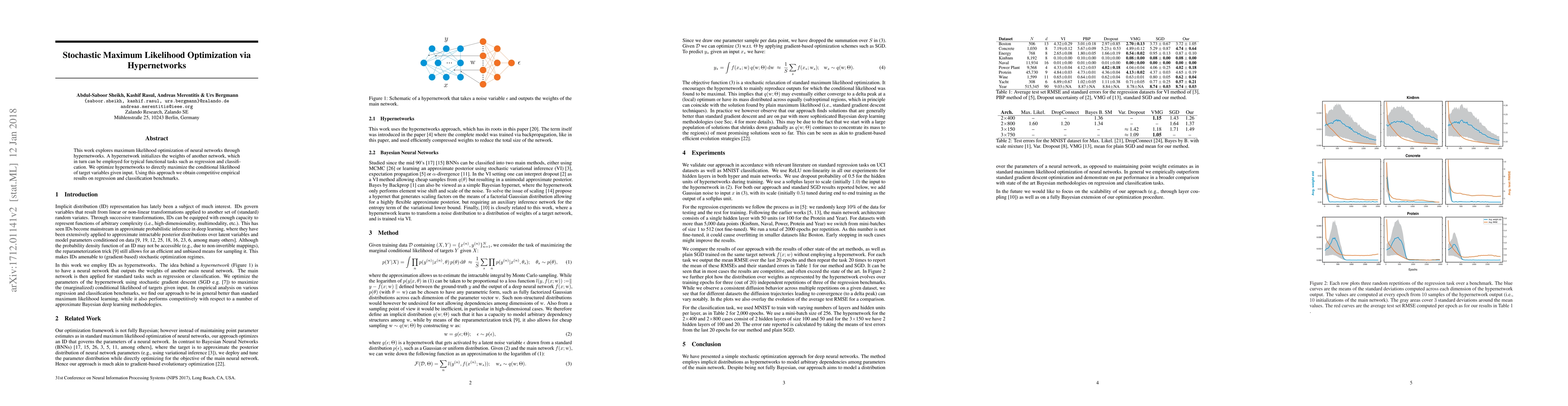 This paper investigates maximum likelihood optimization of neural networks using hypernetworks, which initialize the weights of another network for tasks like regression and classification. The authors optimize hypernetworks to maximize the conditional likelihood of target variables, achieving competitive results on benchmarks.