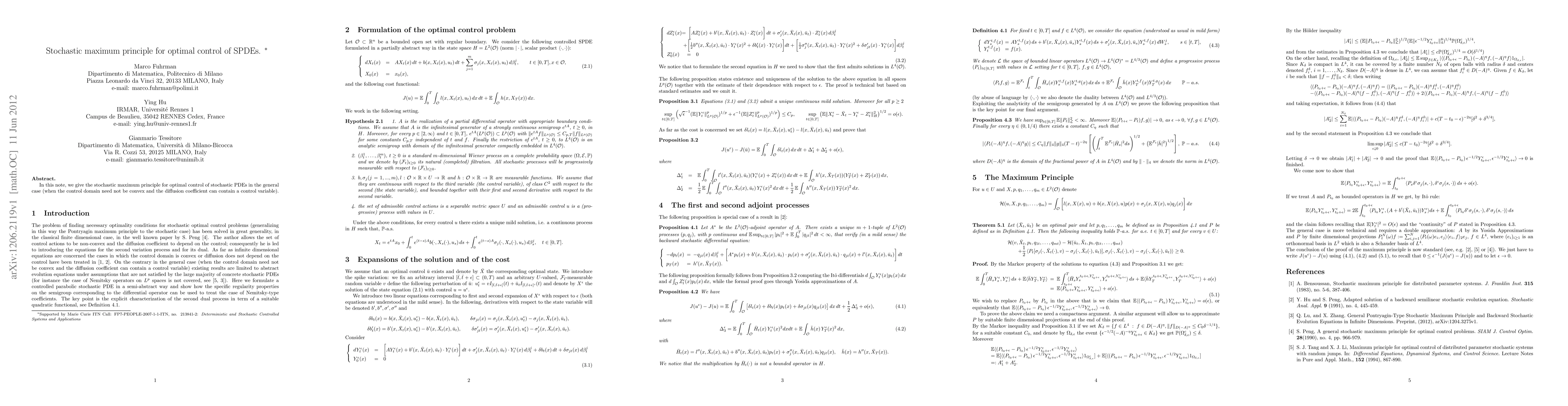 Summary: This paper presents a stochastic maximum principle for optimal control of stochastic partial differential equations (SPDEs), applicable in cases where the control domain is not necessarily convex and the diffusion coefficient may depend on the control variable. The principle provides necessary conditions for optimality in such complex scenarios.