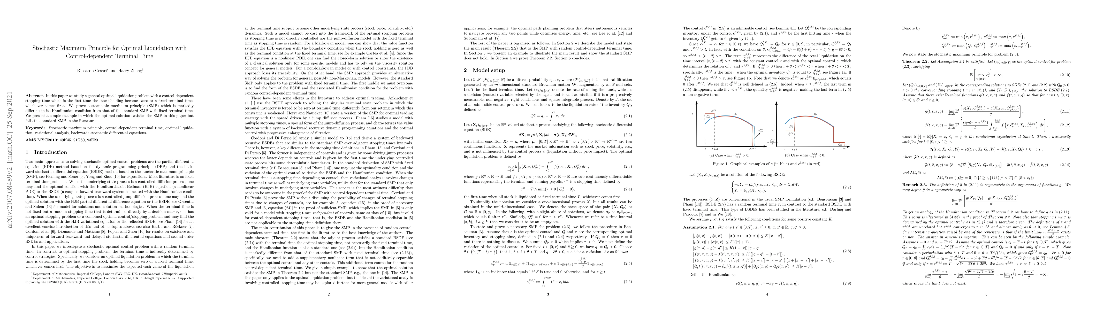 This paper develops a stochastic maximum principle for optimal liquidation problems where the stopping time is control-dependent, allowing the stock holding to reach zero or a fixed terminal time. It presents a unique Hamiltonian condition differing from the standard SMP, illustrated by an example where the proposed SMP applies but the standard SMP does not.
