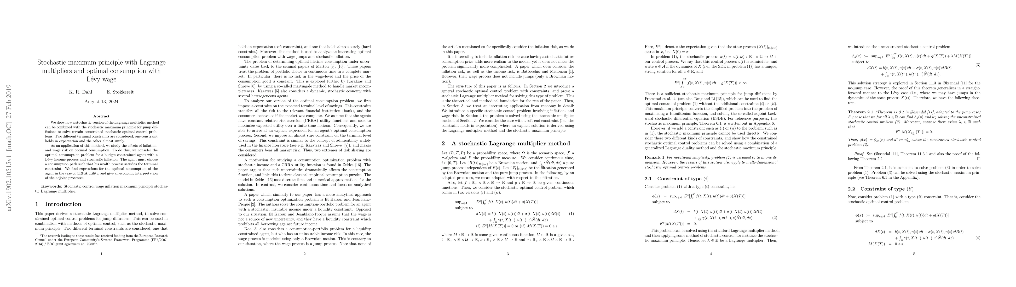 We show how a stochastic version of the Lagrange multiplier method can be combined with the stochastic maximum principle for jump diffusions to solve certain constrained stochastic optimal control problems. Two different terminal constraints are considered; one constraint holds in expectation and the other almost surely. As an application of this method, we study the effects of inflation- and wage risk on optimal consumption. To do this, we consider the optimal consumption problem for a budget constrained agent with a L\'evy income process and stochastic inflation. The agent must choose a consumption path such that his wealth process satisfies the terminal constraint. We find expressions for the optimal consumption of the agent in the case of CRRA utility, and give an economic interpretation of the adjoint processes.