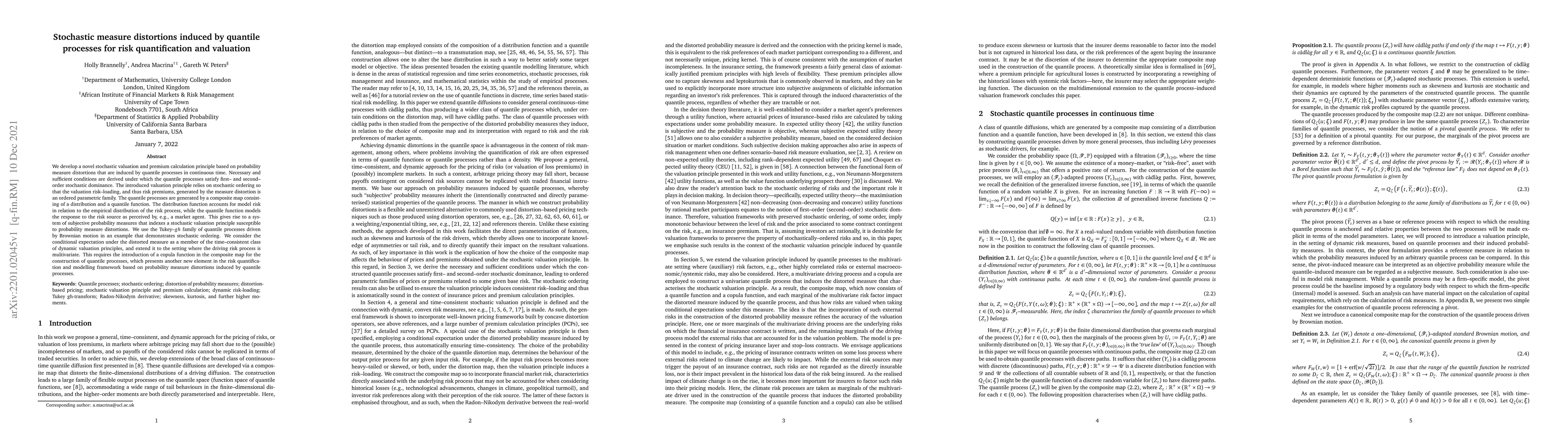 We develop a novel stochastic valuation and premium calculation principle based on probability measure distortions that are induced by quantile processes in continuous time. Necessary and sufficient conditions are derived under which the quantile processes satisfy first- and second-order stochastic dominance. The introduced valuation principle relies on stochastic ordering so that the valuation risk-loading, and thus risk premiums, generated by the measure distortion is an ordered parametric family. The quantile processes are generated by a composite map consisting of a distribution and a quantile function. The distribution function accounts for model risk in relation to the empirical distribution of the risk process, while the quantile function models the response to the risk source as perceived by, e.g., a market agent. This gives rise to a system of subjective probability measures that indexes a stochastic valuation principle susceptible to probability measure distortions. We use the Tukey-$gh$ family of quantile processes driven by Brownian motion in an example that demonstrates stochastic ordering. We consider the conditional expectation under the distorted measure as a member of the time-consistent class of dynamic valuation principles, and extend it to the setting where the driving risk process is multivariate. This requires the introduction of a copula function in the composite map for the construction of quantile processes, which presents another new element in the risk quantification and modelling framework based on probability measure distortions induced by quantile processes.