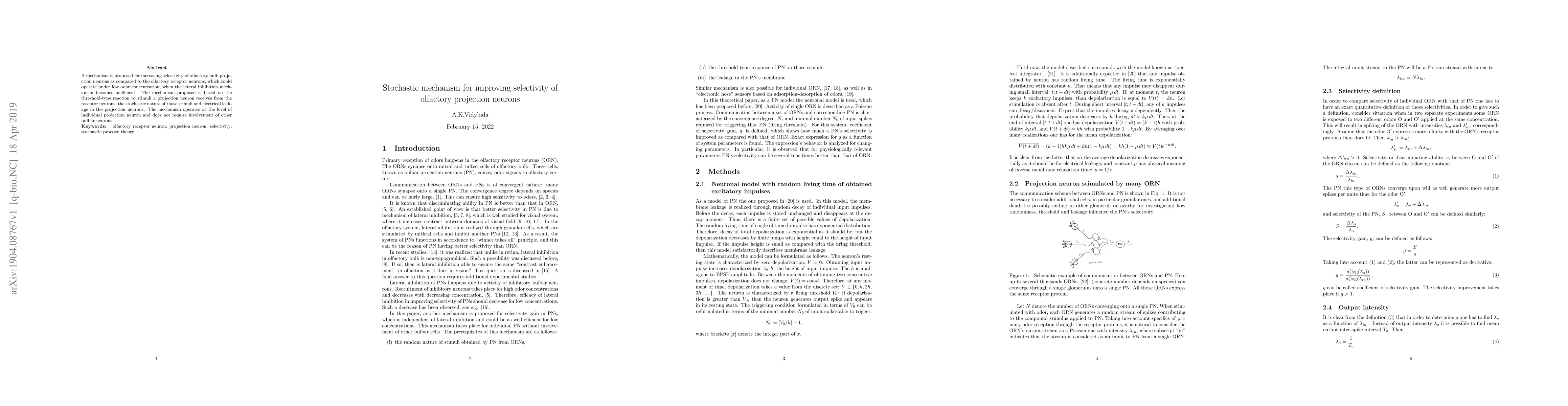 A mechanism is proposed for increasing selectivity of olfactory bulb projection neurons as compared to the olfactory receptor neurons, which could operate under low odor concentration, when the lateral inhibition mechanism becomes inefficient. The mechanism proposed is based on the threshold-type reaction to stimuli a projection neuron receives from the receptor neurons, the stochastic nature of those stimuli and electrical leakage in the projection neurons. The mechanism operates at the level of individual projection neuron and does not require involvement of other bulbar neurons. Keywords: olfactory receptor neuron; projection neuron; selectivity; stochastic process; theory