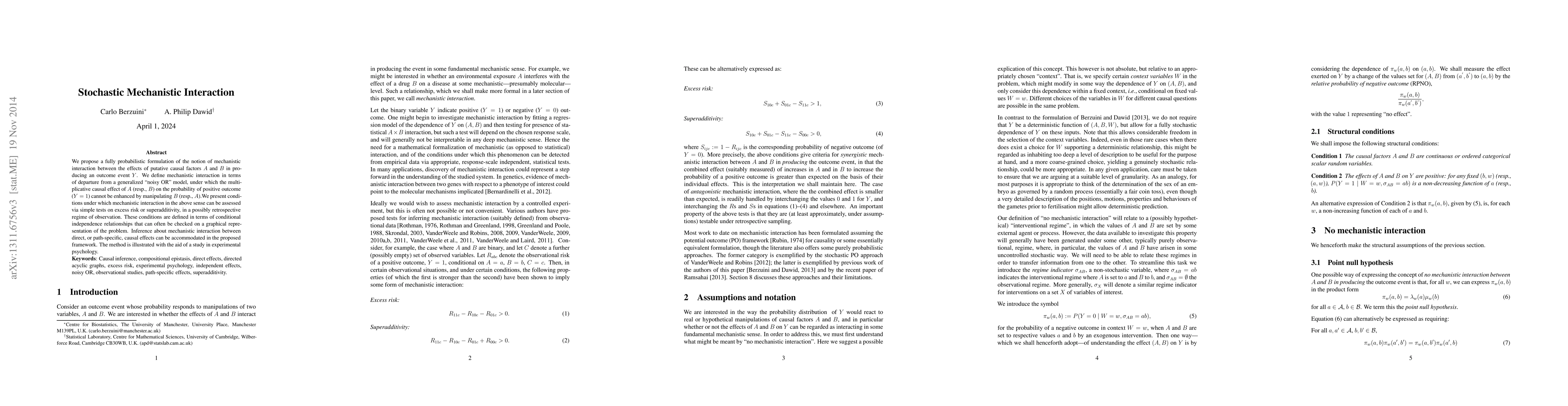 This paper proposes a probabilistic framework to define and assess mechanistic interaction between causal factors A and B affecting a binary outcome. It introduces conditions for detecting such interactions via tests on excess risk or superadditivity, grounded in generalized conditional independence relationships.