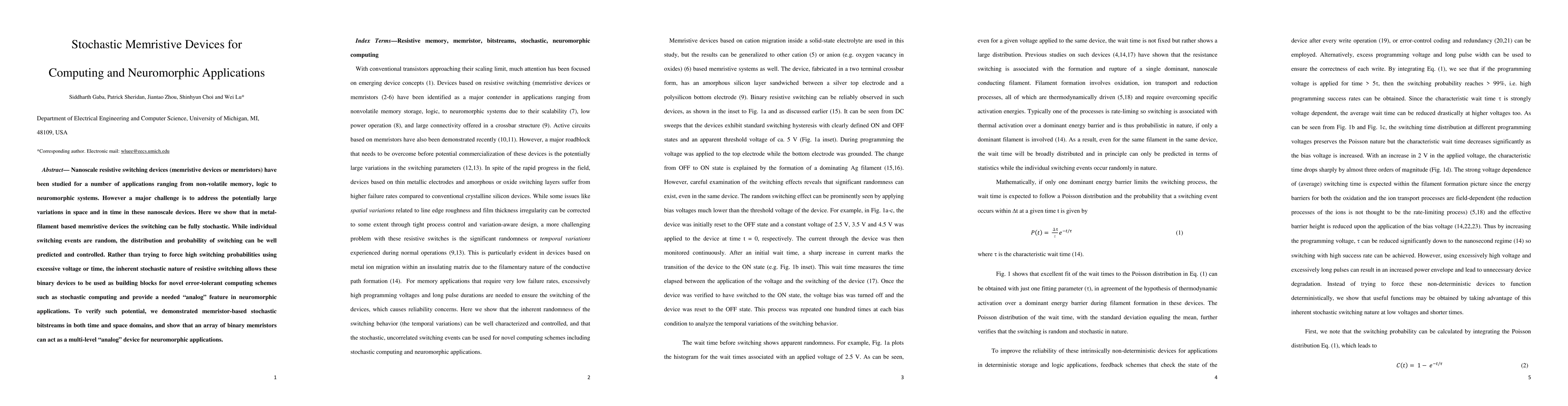 This paper explores the stochastic nature of nanoscale memristive devices for computing and neuromorphic applications, demonstrating that their inherent randomness can be harnessed for error-tolerant computing and analog functionalities in neuromorphic systems. The study shows that despite the randomness, the probability distribution of switching events can be controlled, enabling their use in novel computing schemes.