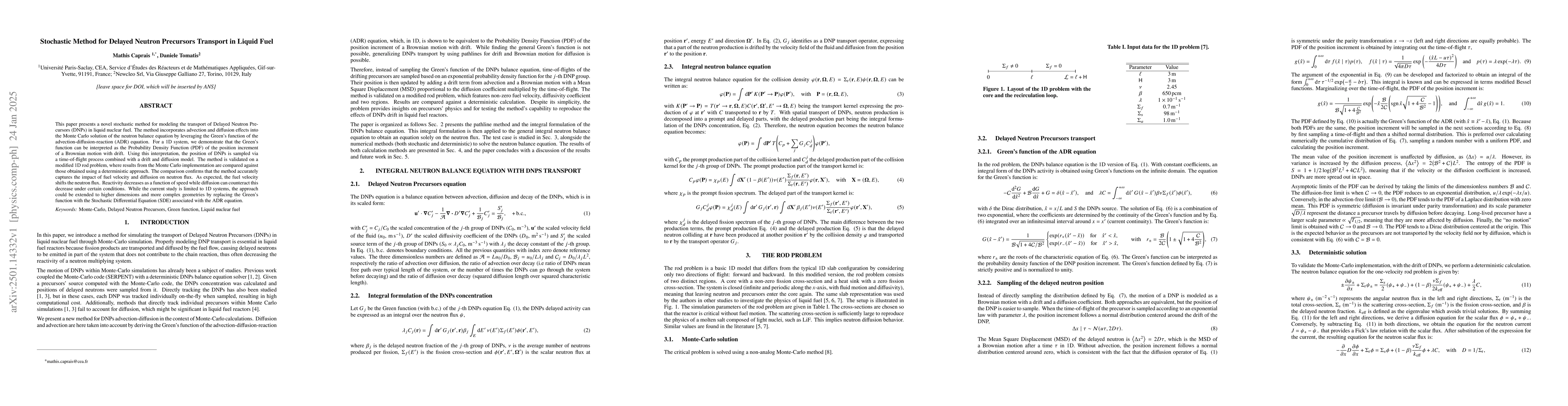 This paper presents a novel stochastic method for modeling the transport of Delayed Neutron Precursors (DNPs) in liquid nuclear fuel. The method incorporates advection and diffusion effects into the Monte Carlo solution of the neutron balance equation by leveraging the Green's function of the advection-diffusion-reaction (ADR) equation. For a 1D system, we demonstrate that the Green's function can be interpreted as the Probability Density Function (PDF) of the position increment of a Brownian motion with drift. Using this interpretation, the position of DNPs is sampled via a time-of-flight process combined with a drift and diffusion model. The method is validated on a modified 1D rod problem, where results from the Monte Carlo implementation are compared against those obtained using a deterministic approach. The comparison confirms that the method accurately captures the impact of fuel velocity and diffusion on neutron flux. As expected, the fuel velocity shifts the neutron flux. Reactivity decreases as a function of speed while diffusion can counteract this decrease under certain conditions. While the current study is limited to 1D systems, the approach could be extended to higher dimensions and more complex geometries by replacing the Green's function with the Stochastic Differential Equation (SDE) associated with the ADR equation.