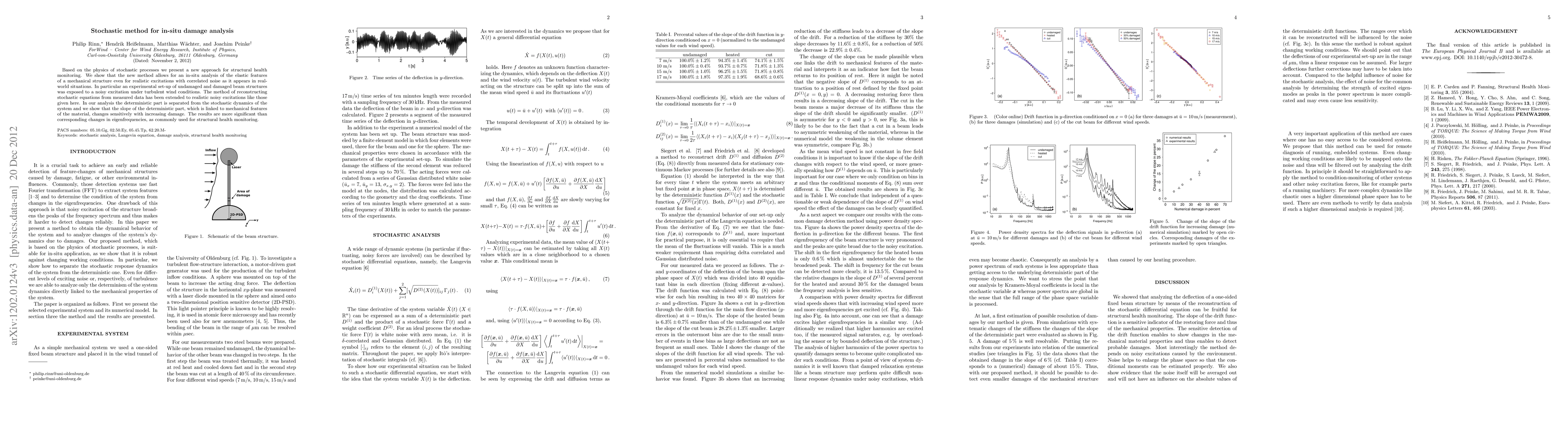 Based on the physics of stochastic processes we present a new approach for structural health monitoring. We show that the new method allows for an in-situ analysis of the elastic features of a mechanical structure even for realistic excitations with correlated noise as it appears in real-world situations. In particular an experimental set-up of undamaged and damaged beam structures was exposed to a noisy excitation under turbulent wind conditions. The method of reconstructing stochastic equations from measured data has been extended to realistic noisy excitations like those given here. In our analysis the deterministic part is separated from the stochastic dynamics of the system and we show that the slope of the deterministic part, which is linked to mechanical features of the material, changes sensitively with increasing damage. The results are more significant than corresponding changes in eigenfrequencies, as commonly used for structural health monitoring.