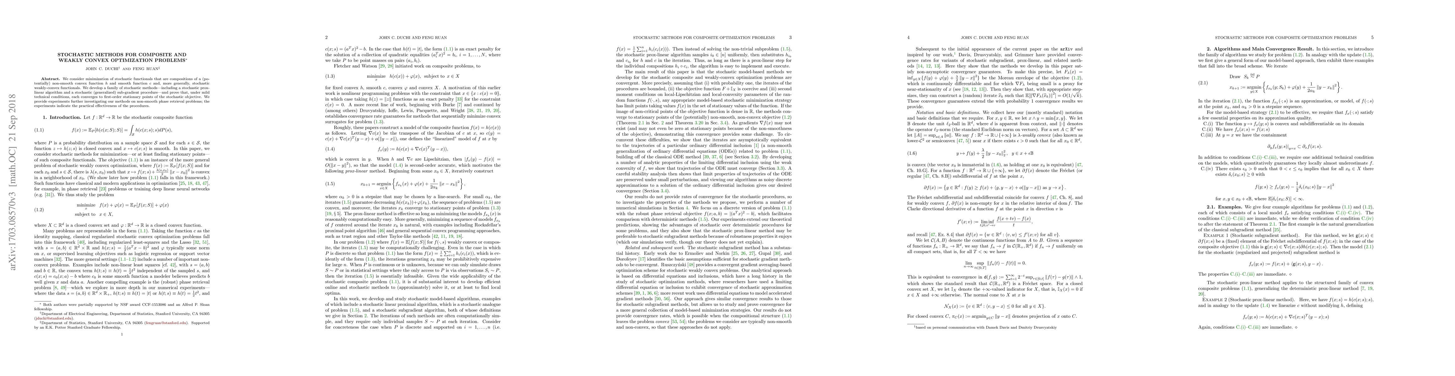 This paper develops stochastic methods for optimizing composite and weakly convex functions, including a stochastic prox-linear algorithm and a generalized sub-gradient procedure. Theoretical convergence to first-order stationary points is proven under mild conditions, and experiments on phase retrieval problems demonstrate practical effectiveness.