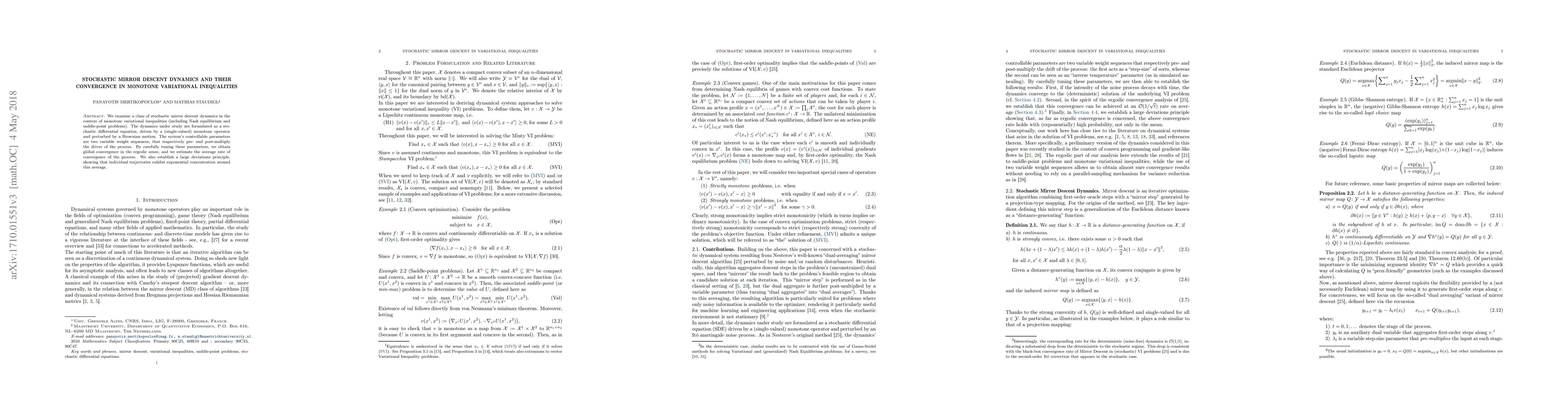 This paper explores stochastic mirror descent dynamics for monotone variational inequalities, proving global convergence and estimating the average rate of convergence. It also establishes a large deviations principle for exponential concentration of individual trajectories around the average convergence.