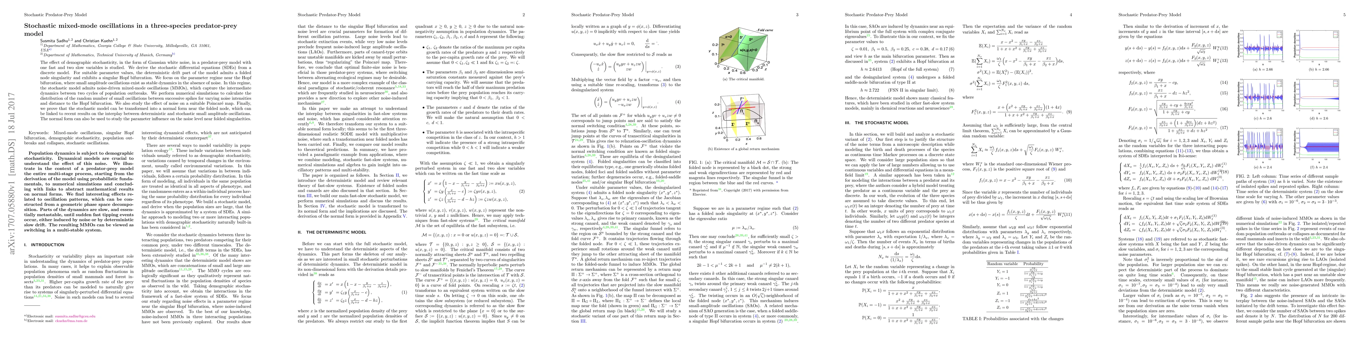 This paper investigates the impact of demographic stochasticity on a three-species predator-prey model, deriving stochastic differential equations from a discrete model. It explores mixed-mode oscillations near a singular Hopf bifurcation, demonstrating how noise influences intermediate dynamics and validating findings through numerical simulations and a normal form analysis.