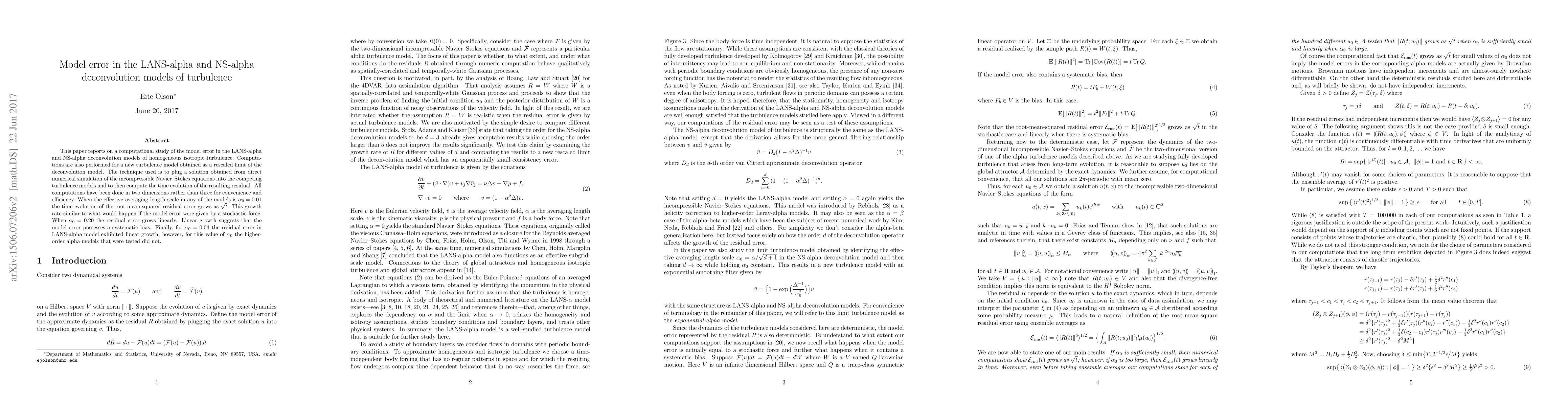 This paper reports on a computational study of the model error in the LANS-alpha and NS-alpha deconvolution models of homogeneous isotropic turbulence. The focus is on how well the model error may be characterized by a stochastic force. Computations are also performed for a new turbulence model obtained as a rescaled limit of the deconvolution model. The technique used is to plug a solution obtained from direct numerical simulation of the incompressible Navier--Stokes equations into the competing turbulence models and to then compute the time evolution of the resulting residual. All computations have been done in two dimensions rather than three for convenience and efficiency. When the effective averaging length scale in any of the models is $\alpha_0=0.01$ the time evolution of the root-mean-squared residual error grows as $\sqrt t$. This growth rate is consistent with the hypothesis that the model error may be characterized by a stochastic force. When $\alpha_0=0.20$ the residual error grows linearly. Linear growth suggests that the model error possesses a systematic bias which dominates the stochastic terms. Finally, for $\alpha_0=0.04$ the LANS-alpha model possessed systematic bias; however, for this value of $\alpha_0$ the higher-order alpha models that were tested did not.