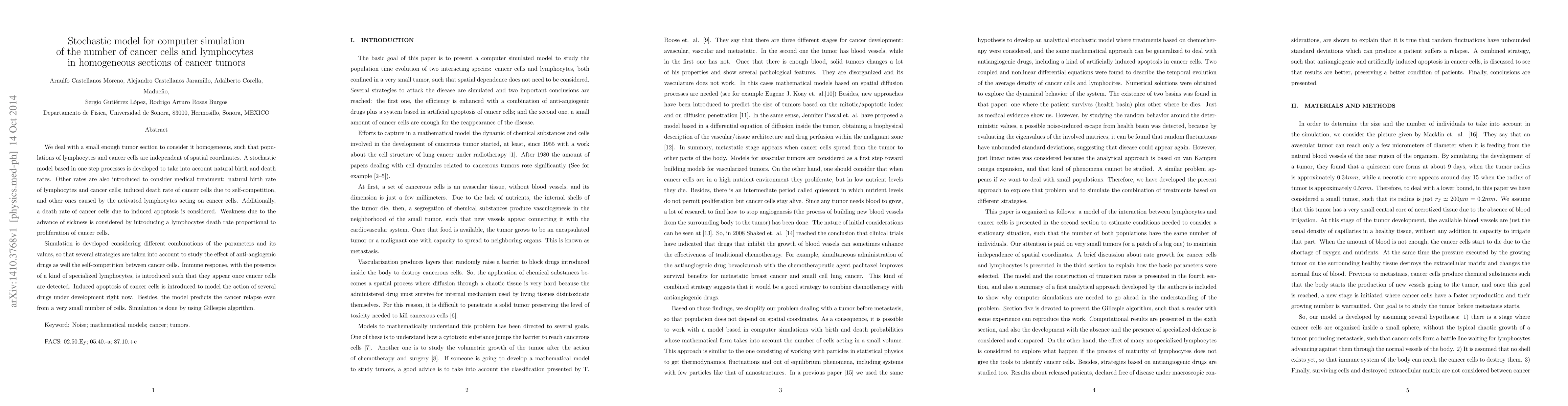 We deal with a small enough tumor section to consider it homogeneous, such that populations of lymphocytes and cancer cells are independent of spatial coordinates. A stochastic model based in one step processes is developed to take into account natural birth and death rates. Other rates are also introduced to consider medical treatment: natural birth rate of lymphocytes and cancer cells; induced death rate of cancer cells due to self-competition, and other ones caused by the activated lymphocytes acting on cancer cells. Additionally, a death rate of cancer cells due to induced apoptosis is considered. Weakness due to the advance of sickness is considered by introducing a lymphocytes death rate proportional to proliferation of cancer cells. Simulation is developed considering different combinations of the parameters and its values, so that several strategies are taken into account to study the effect of anti-angiogenic drugs as well the self-competition between cancer cells. Immune response, with the presence of a kind of specialized lymphocytes, is introduced such that they appear once cancer cells are detected. Induced apoptosis of cancer cells is introduced to model the action of several drugs under development right now. Besides, the model predicts the cancer relapse even from a very small number of cells. Simulation is done by using Gillespie algorithm.