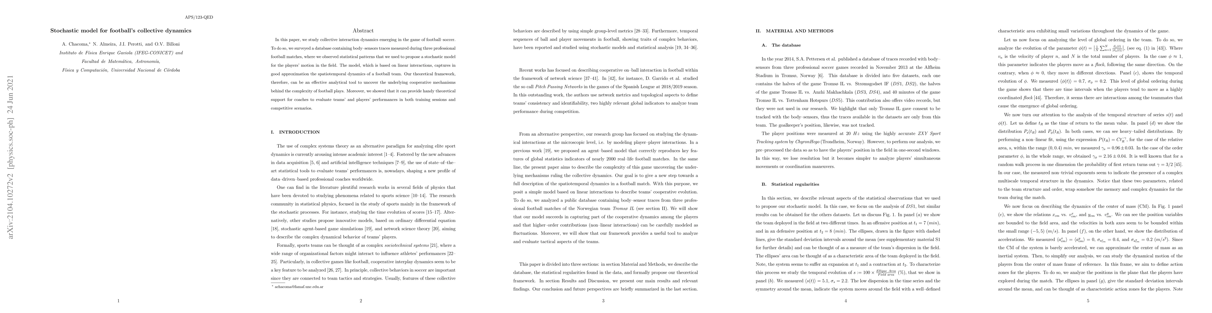 A stochastic model is proposed to analyze collective dynamics in football, capturing player motion patterns with good accuracy. The model provides a framework for understanding cooperative mechanisms behind football plays and supporting coaches' evaluations of team performance.