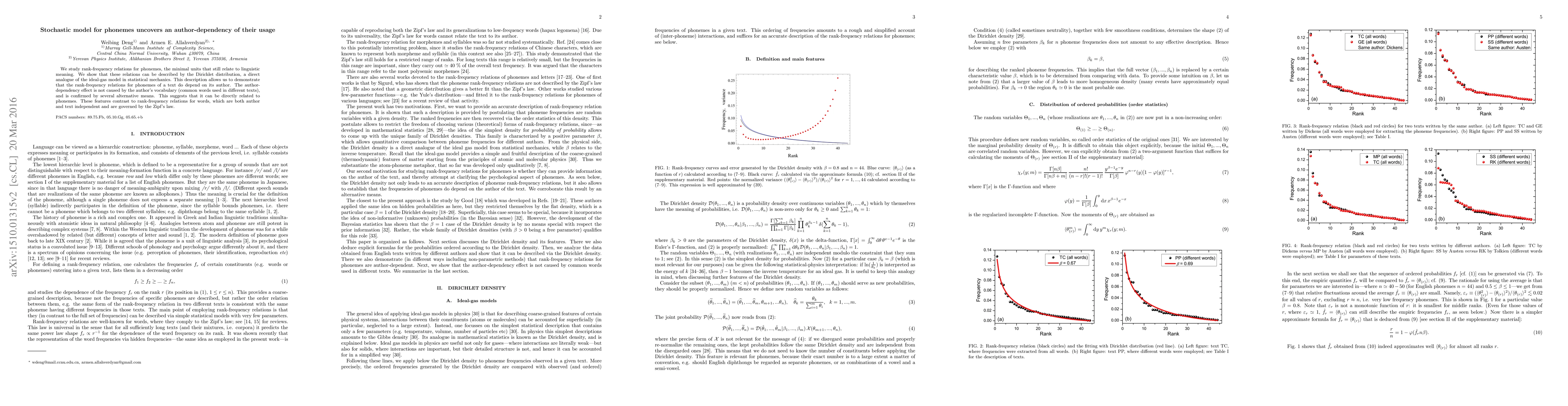 We study rank-frequency relations for phonemes, the minimal units that still relate to linguistic meaning. We show that these relations can be described by the Dirichlet distribution, a direct analogue of the ideal-gas model in statistical mechanics. This description allows us to demonstrate that the rank-frequency relations for phonemes of a text do depend on its author. The author-dependency effect is not caused by the author's vocabulary (common words used in different texts), and is confirmed by several alternative means. This suggests that it can be directly related to phonemes. These features contrast to rank-frequency relations for words, which are both author and text independent and are governed by the Zipf's law.