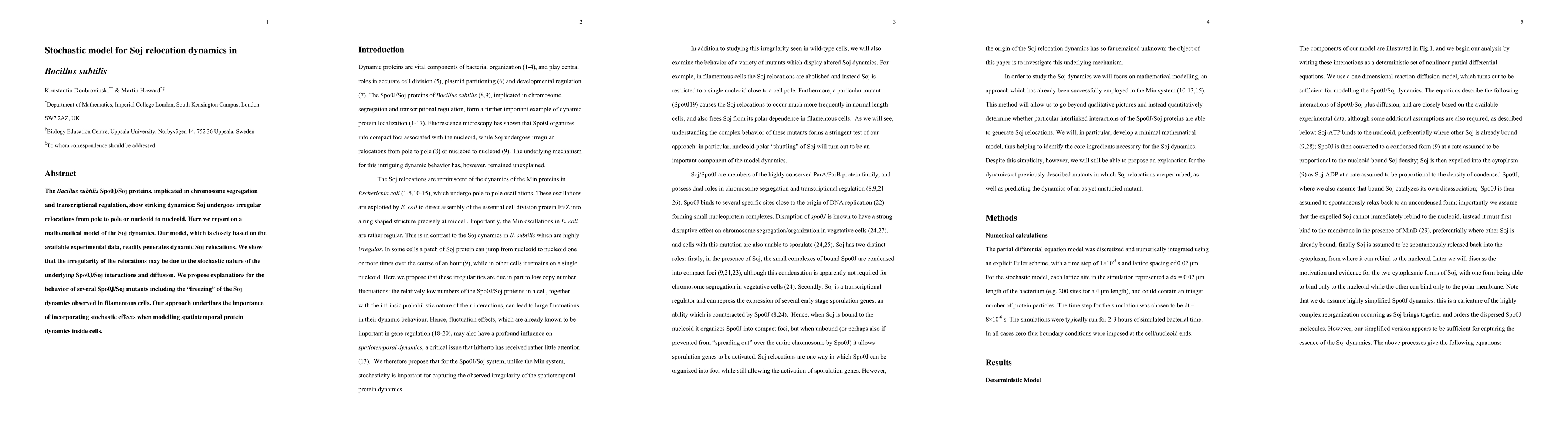 This paper presents a stochastic model to describe the dynamic relocation of Soj proteins in Bacillus subtilis, highlighting the irregular relocations driven by stochastic interactions and diffusion. The model explains mutant behaviors and underscores the necessity of stochastic effects in modeling intracellular protein dynamics.