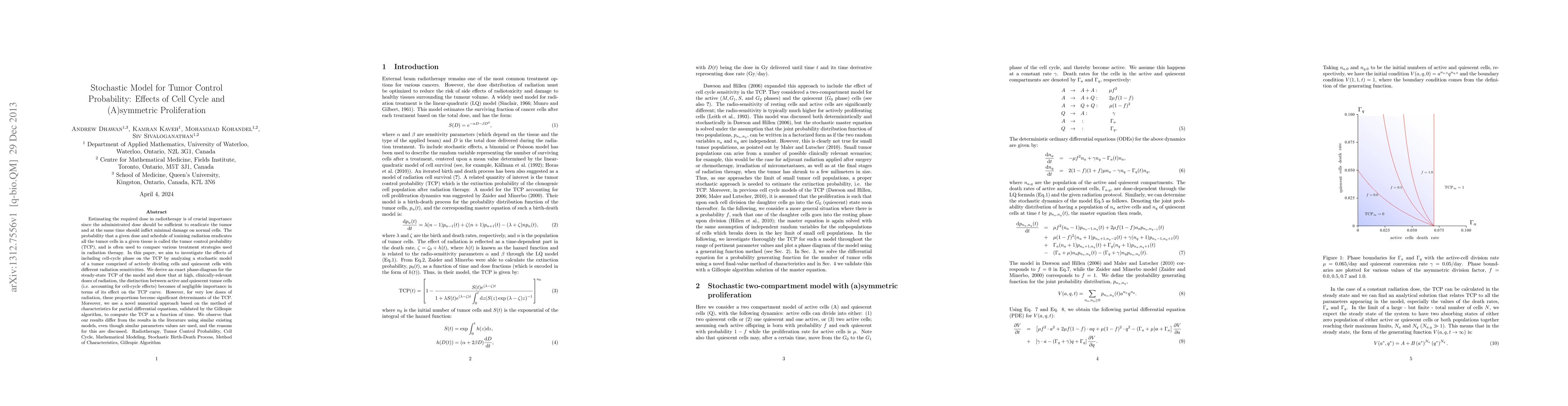 Estimating the required dose in radiotherapy is of crucial importance since the administrated dose should be sufficient to eradicate the tumor and at the same time should inflict minimal damage on normal cells. The probability that a given dose and schedule of ionizing radiation eradicates all the tumor cells in a given tissue is called the tumor control probability (TCP), and is often used to compare various treatment strategies used in radiation therapy. In this paper, we aim to investigate the effects of including cell-cycle phase on the TCP by analyzing a stochastic model of a tumor comprised of actively dividing cells and quiescent cells with different radiation sensitivities. We derive an exact phase-diagram for the steady-state TCP of the model and show that at high, clinically-relevant doses of radiation, the distinction between active and quiescent tumor cells (i.e. accounting for cell-cycle effects) becomes of negligible importance in terms of its effect on the TCP curve. However, for very low doses of radiation, these proportions become significant determinants of the TCP. Moreover, we use a novel numerical approach based on the method of characteristics for partial differential equations, validated by the Gillespie algorithm, to compute the TCP as a function of time. We observe that our results differ from the results in the literature using similar existing models, even though similar parameters values are used, and the reasons for this are discussed.