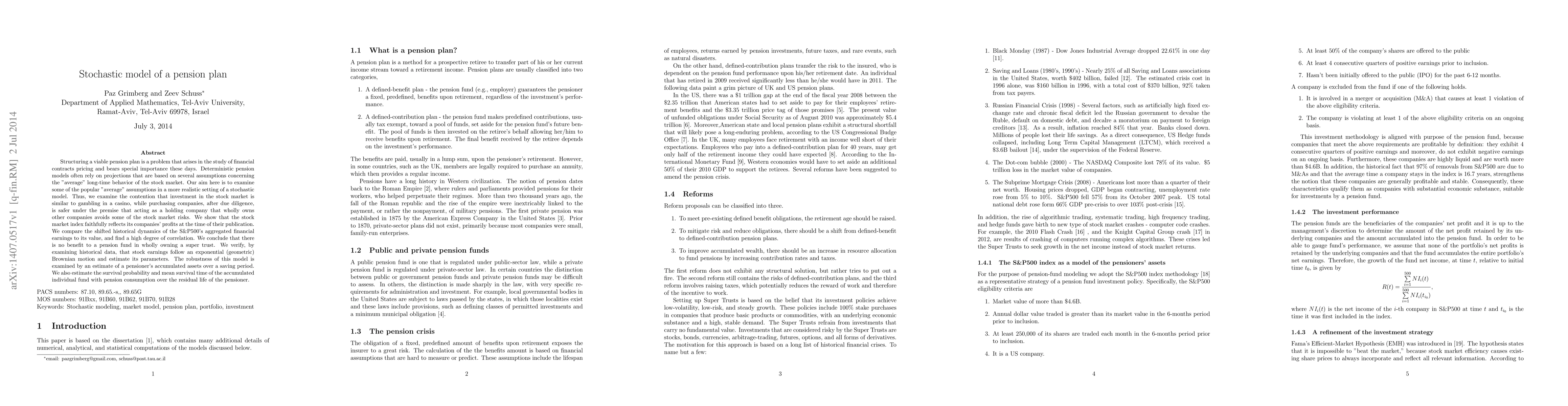Structuring a viable pension plan is a problem that arises in the study of financial contracts pricing and bears special importance these days. Deterministic pension models often rely on projections that are based on several assumptions concerning the "average" long-time behavior of the stock market. Our aim here is to examine some of the popular "average" assumptions in a more realistic setting of a stochastic model. Thus, we examine the contention that investment in the stock market is similar to gambling in a casino, while purchasing companies, after due diligence, is safer under the premise that acting as a holding company that wholly owns other companies avoids some of the stock market risks. We show that the stock market index faithfully reflects its companies' profits at the time of their publication. We compare the shifted historical dynamics of the S\&P500's aggregated financial earnings to its value, and find a high degree of correlation. We conclude that there is no benefit to a pension fund in wholly owning a super trust. We verify, by examining historical data, that stock earnings follow an exponential (geometric) Brownian motion and estimate its parameters. The robustness of this model is examined by an estimate of a pensioner's accumulated assets over a saving period. We also estimate the survival probability and mean survival time of the accumulated individual fund with pension consumption over the residual life of the pensioner.