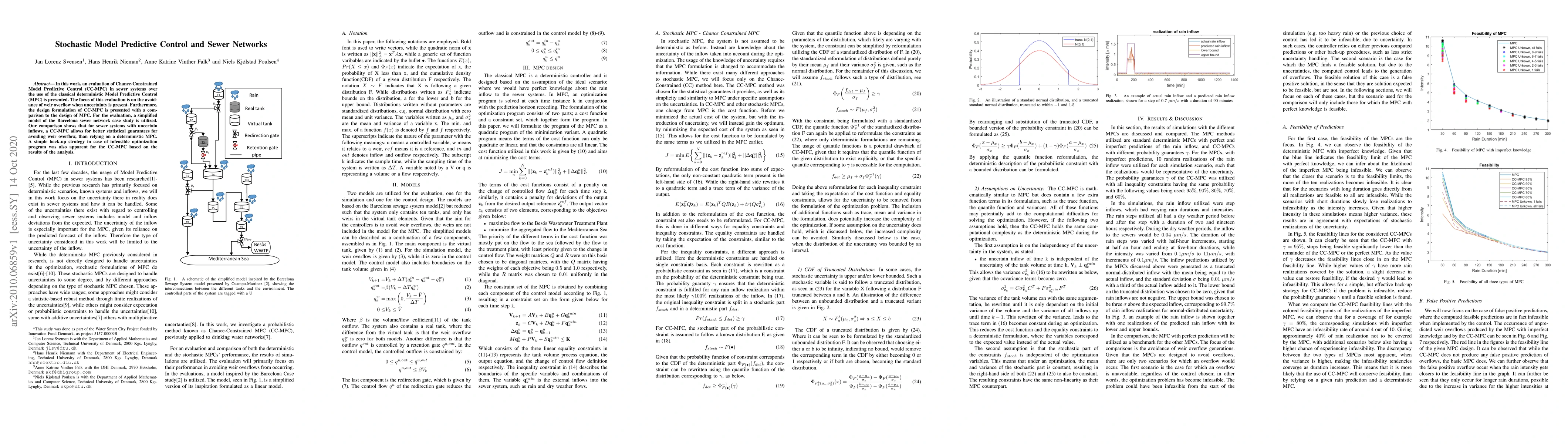 The research evaluates Chance-Constrained Model Predictive Control (CC-MPC) against classical deterministic Model Predictive Control (MPC) in sewer systems, focusing on avoiding weir overflow with uncertain inflows. A simplified model of the Barcelona sewer network is used for the evaluation.
