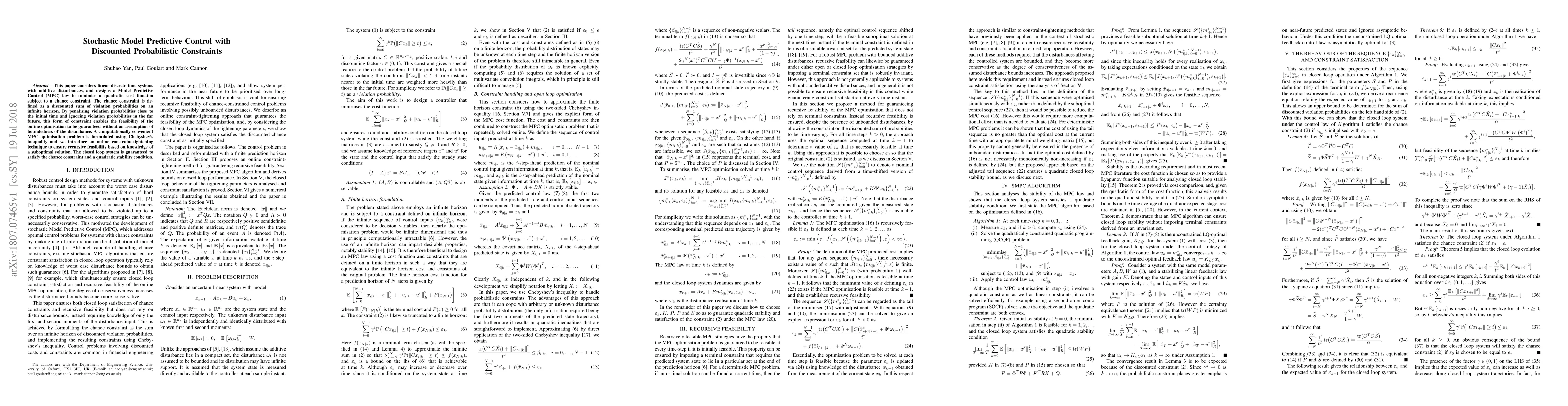 This paper introduces a new Model Predictive Control approach that incorporates probabilistic constraints, allowing for online optimization without assuming bounded disturbance values. The method ensures recursive feasibility and quadratic stability.