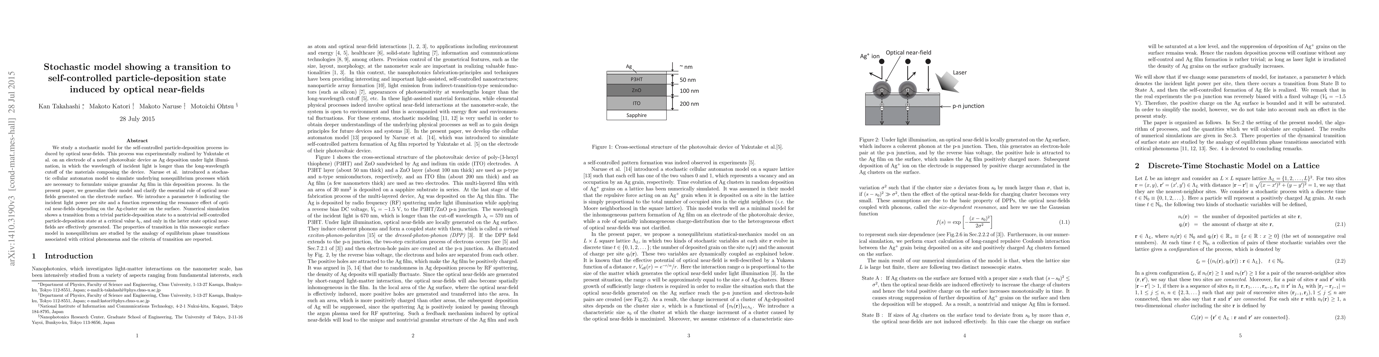 This paper generalizes a stochastic model to study self-controlled particle-deposition induced by optical near-fields, revealing a transition to a nontrivial state at a critical light power value. The model introduces parameters to represent incident light power and resonance effects, showing effective near-field generation in the self-controlled state.