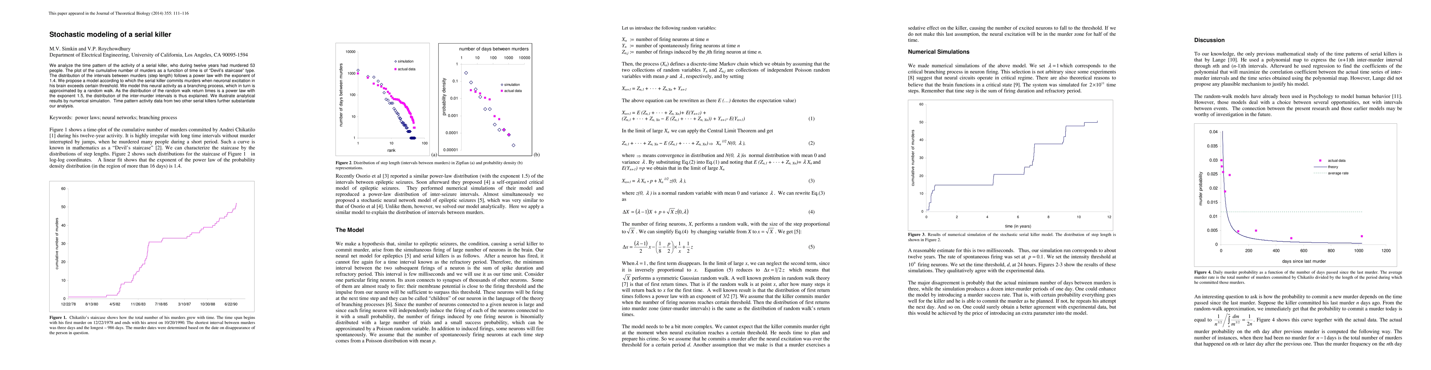 A serial killer's murder pattern follows a power law distribution of intervals between crimes, suggesting that neural activity in their brain exceeds a certain threshold before committing a murder.