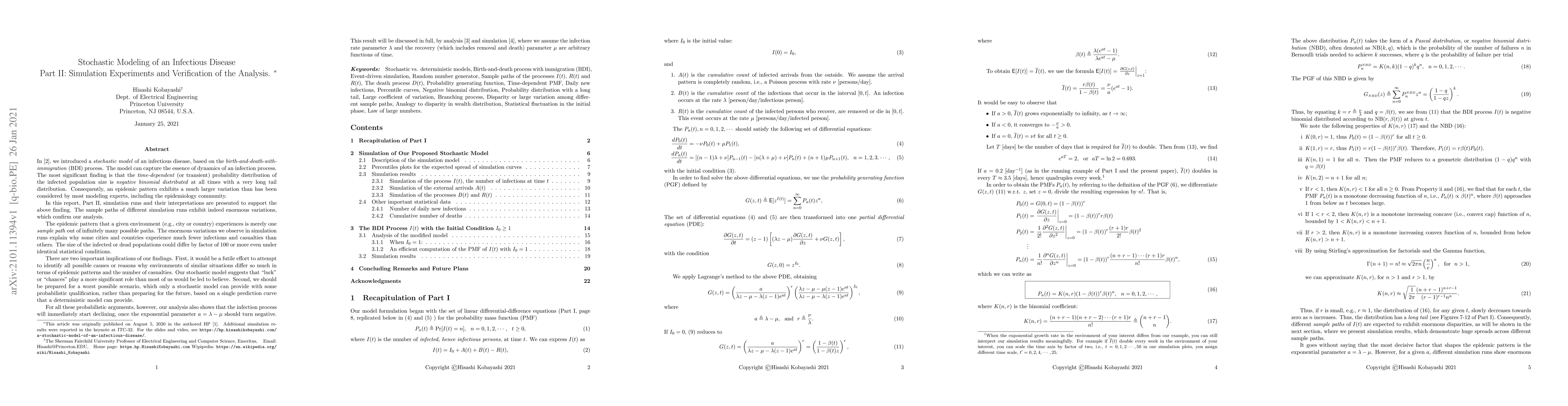 In Part 1, we introduced a stochastic model of an infectious disease, based on the BDI (birth and death with immigration) process. We showed that random processes defined by this model can capture the essence of the stochastic, often erratic, behavior of the infection process. The most significant finding was that it is negative binomial distributed with small r, hence it is geometrically distributed with an exceedingly long tail. This leads to a much larger disparity in the epidemic patterns than has been known to the modeling community. In Part 2 we conduct simulation experiments by implementing an event-driven simulator. Several independent runs are presented to verify the findings reported in Part 1. The enormous variations among the sample paths obtained from several consecutive and independent runs with statistically identical conditions confirm our analysis. Note that the epidemic pattern that we observe is merely one sample path taken out of infinitely many paths. Thus, one such path cannot represent the ensemble of the underlying random process. By plotting the simulation runs in the semi-log scale, we can see that the probabilistic chances in the early phase of the infection process determine the behavior of the process. Once the process has reached a considerable number, the weak law of large numbers sets in, and the process behaves less erratically than in the early phase. One important implication of our findings is that it would be a futile effort to attempt to identify all plausible causes of the epidemic patterns. Mere luck may play a more significant role than most people believe. It would be worth remarking that the BDI process might be applicable to explain the disparity in wealth among individuals of similar earning power, expenditure, and investment portfolio.