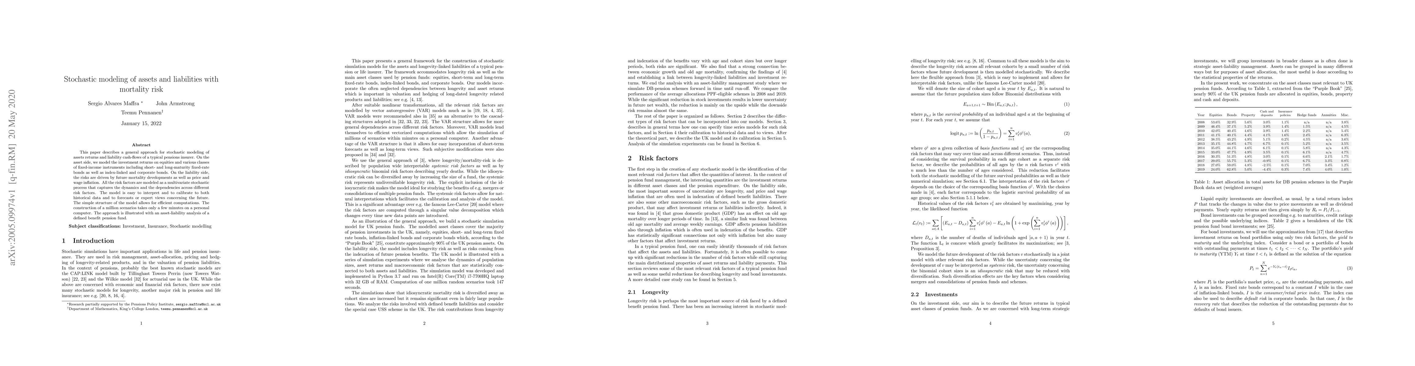 A new approach is presented for stochastic modeling of assets and liabilities with mortality risk, offering a simple structure for efficient computations and easy interpretation, while capturing dynamics and dependencies across different risk factors.
