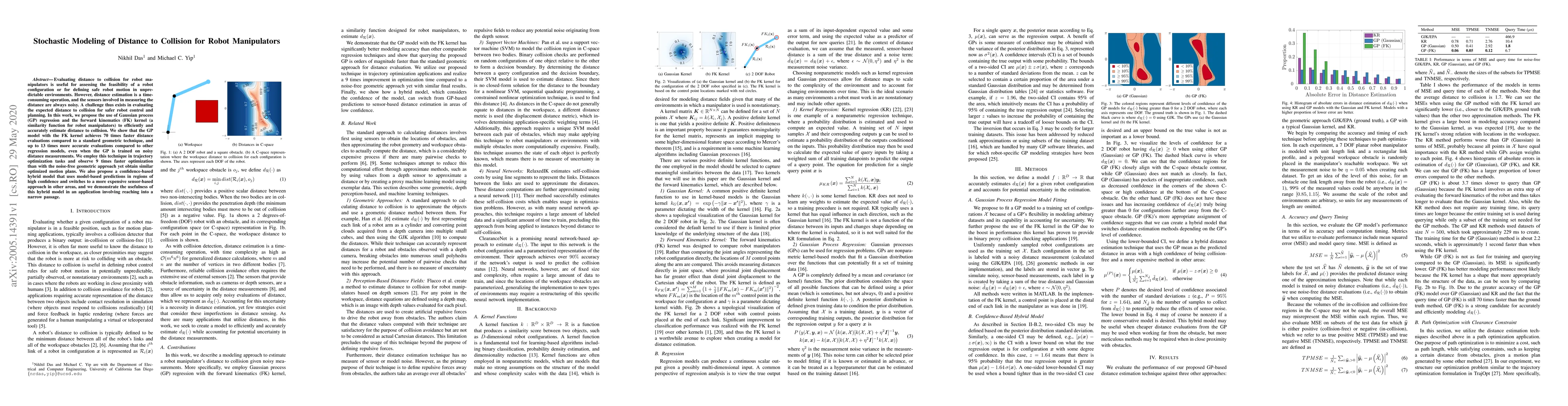 Evaluating distance to collision for robot manipulators is useful for assessing the feasibility of a robot configuration or for defining safe robot motion in unpredictable environments. However, distance estimation is a timeconsuming operation, and the sensors involved in measuring the distance are always noisy. A challenge thus exists in evaluating the expected distance to collision for safer robot control and planning. In this work, we propose the use of Gaussian process (GP) regression and the forward kinematics (FK) kernel (a similarity function for robot manipulators) to efficiently and accurately estimate distance to collision. We show that the GP model with the FK kernel achieves 70 times faster distance evaluations compared to a standard geometric technique, and up to 13 times more accurate evaluations compared to other regression models, even when the GP is trained on noisy distance measurements. We employ this technique in trajectory optimization tasks and observe 9 times faster optimization than with the noise-free geometric approach yet obtain similar optimized motion plans. We also propose a confidence-based hybrid model that uses model-based predictions in regions of high confidence and switches to a more expensive sensor-based approach in other areas, and we demonstrate the usefulness of this hybrid model in an application involving reaching into a narrow passage.