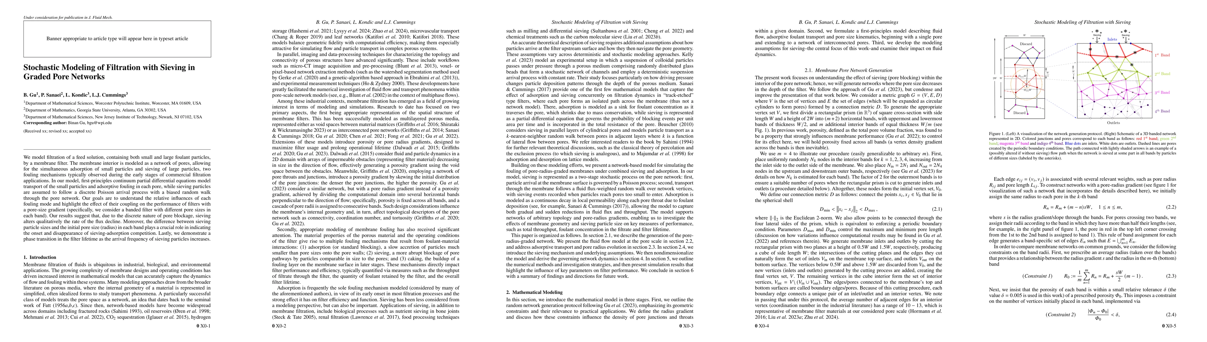 We model filtration of a feed solution, containing both small and large foulant particles, by a membrane filter. The membrane interior is modeled as a network of pores, allowing for the simultaneous adsorption of small particles and sieving of large particles, two fouling mechanisms typically observed during the early stages of commercial filtration applications. In our model, first-principles continuum partial differential equations model transport of the small particles and adsorptive fouling in each pore, while sieving particles are assumed to follow a discrete Poisson arrival process with a biased random walk through the pore network. Our goals are to understand the relative influences of each fouling mode and highlight the effect of their coupling on the performance of filters with a pore-size gradient (specifically, we consider a banded filter with different pore sizes in each band). Our results suggest that, due to the discrete nature of pore blockage, sieving alters qualitatively the rate of the flux decline. Moreover, the difference between sieving particle sizes and the initial pore size (radius) in each band plays a crucial role in indicating the onset and disappearance of sieving-adsorption competition. Lastly, we demonstrate a phase transition in the filter lifetime as the arrival frequency of sieving particles increases.