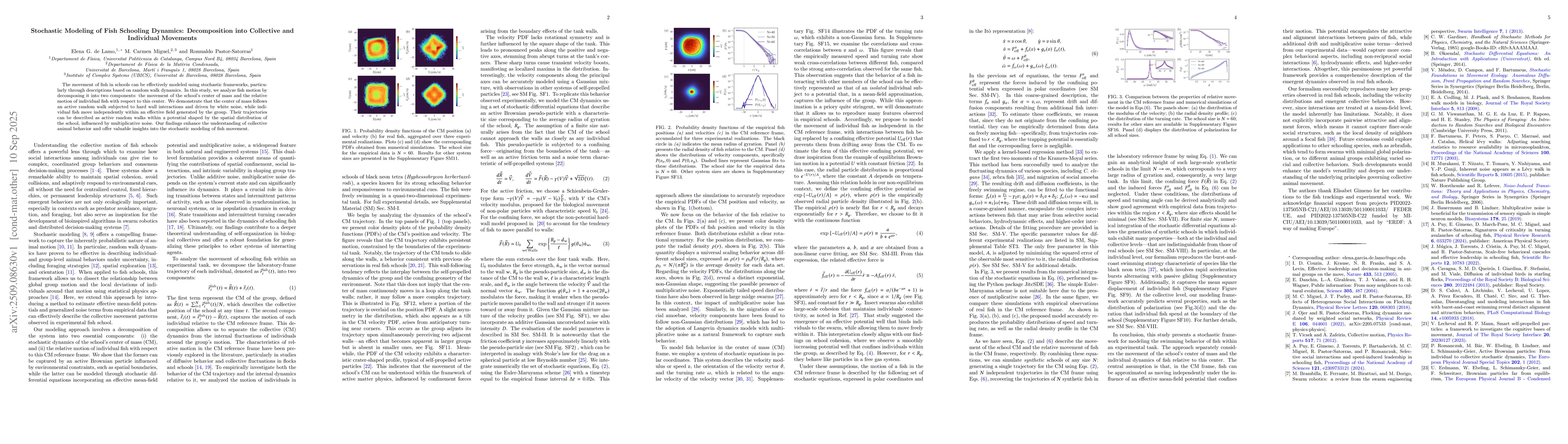 The movement of fish in schools can be effectively modeled using stochastic frameworks, particularly through descriptions based on random walk dynamics. In this study, we analyze fish motion by decomposing it into two components: the movement of the school's center of mass and the relative motion of individual fish with respect to this center. We demonstrate that the center of mass follows an active random walk subjected to hard wall interactions and driven by white noise, while individual fish move independently within an effective field generated by the group. Their trajectories can be described as active random walks within a potential shaped by the spatial distribution of the school, influenced by multiplicative noise. Our findings enhance the understanding of collective animal behavior and offer valuable insights into the stochastic modeling of fish movement.