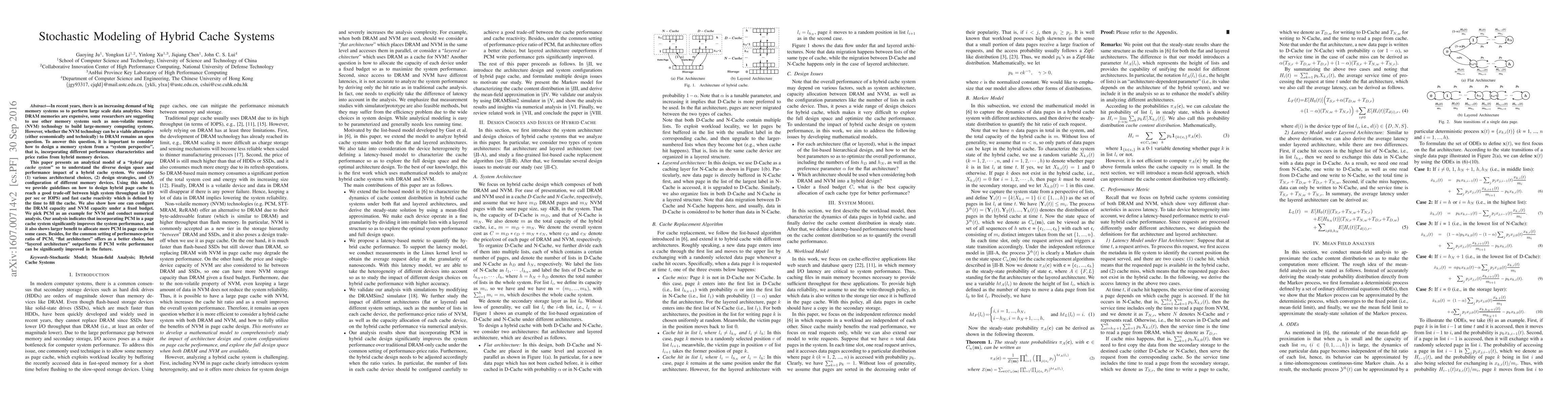 This paper presents a stochastic model for designing hybrid cache systems that combine DRAM and non-volatile memory (NVM) technologies to optimize performance and cost. It finds that incorporating NVM in page caches can significantly improve system performance and suggests optimal configurations for different scenarios.