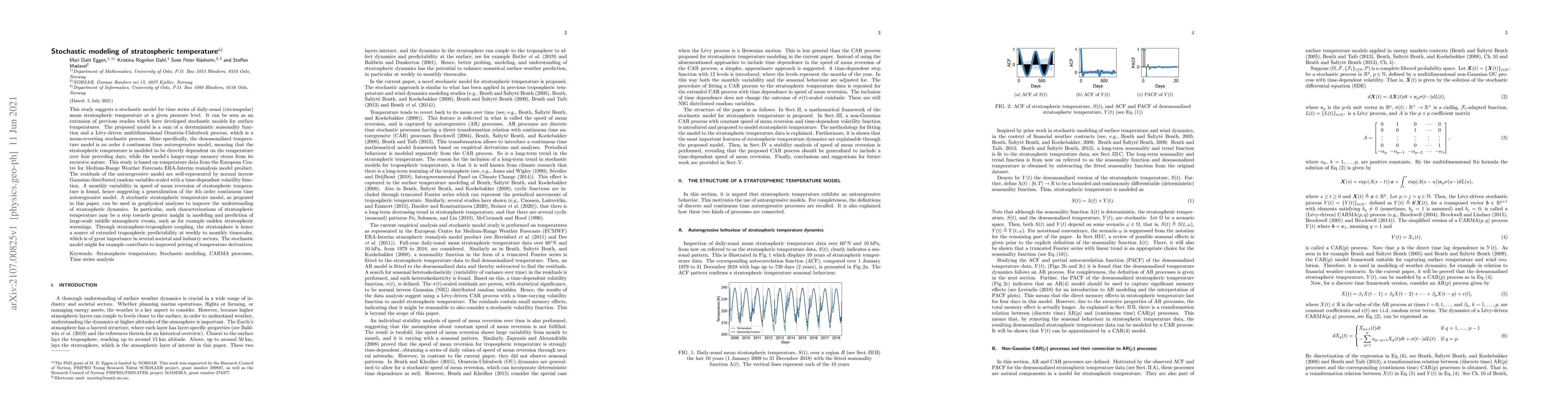 This study suggests a stochastic model for time series of daily-zonal (circumpolar) mean stratospheric temperature at a given pressure level. It can be seen as an extension of previous studies which have developed stochastic models for surface temperatures. The proposed model is a sum of a deterministic seasonality function and a L\'evy-driven multidimensional Ornstein-Uhlenbeck process, which is a mean-reverting stochastic process. More specifically, the deseasonalized temperature model is an order 4 continuous time autoregressive model, meaning that the stratospheric temperature is modeled to be directly dependent on the temperature over four preceding days, while the model's longer-range memory stems from its recursive nature. This study is based on temperature data from the European Centre for Medium-Range Weather Forecasts ERA-Interim reanalysis model product. The residuals of the autoregressive model are well-represented by normal inverse Gaussian distributed random variables scaled with a time-dependent volatility function. A monthly variability in speed of mean reversion of stratospheric temperature is found, hence suggesting a generalization of the 4th order continuous time autoregressive model. A stochastic stratospheric temperature model, as proposed in this paper, can be used in geophysical analyses to improve the understanding of stratospheric dynamics. In particular, such characterizations of stratospheric temperature may be a step towards greater insight in modeling and prediction of large-scale middle atmospheric events, such as for example sudden stratospheric warmings. Through stratosphere-troposphere coupling, the stratosphere is hence a source of extended tropospheric predictability at weekly to monthly timescales, which is of great importance in several societal and industry sectors.