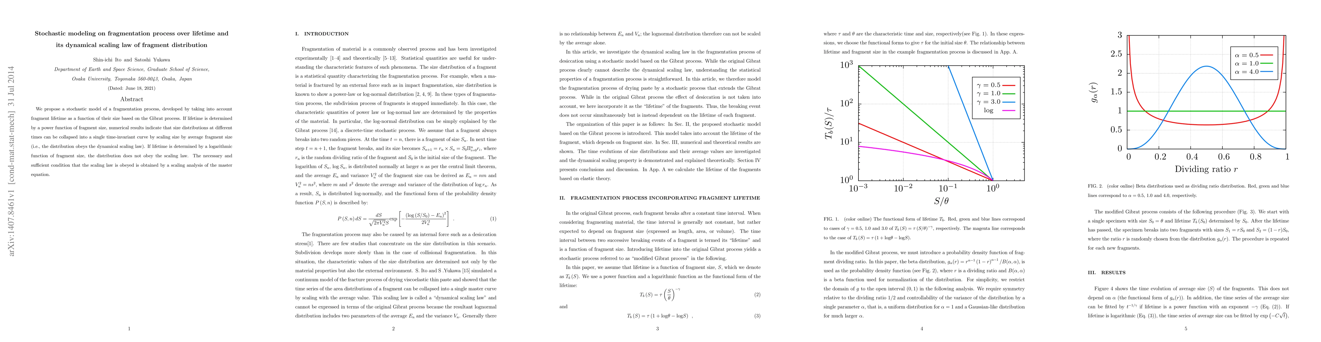 We propose a stochastic model of a fragmentation process, developed by taking into account fragment lifetime as a function of their size based on the Gibrat process. If lifetime is determined by a power function of fragment size, numerical results indicate that size distributions at different times can be collapsed into a single time-invariant curve by scaling size by average fragment size (i.e., the distribution obeys the dynamical scaling law). If lifetime is determined by a logarithmic function of fragment size, the distribution does not obey the scaling law. The necessary and sufficient condition that the scaling law is obeyed is obtained by a scaling analysis of the master equation.