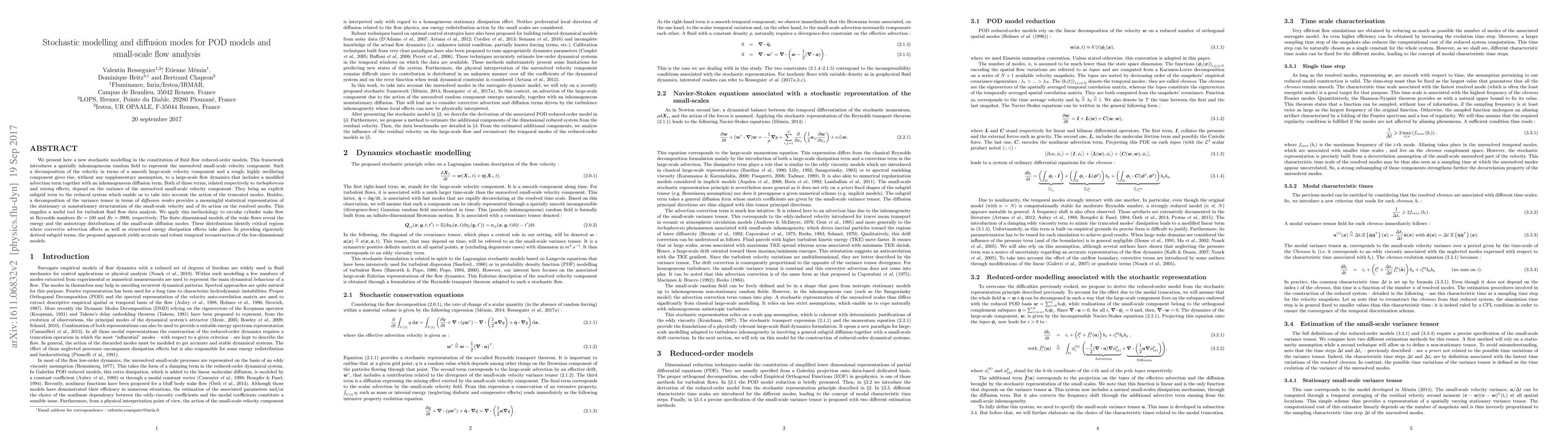 We present here a new stochastic modelling in the constitution of fluid flow reduced-order models. This framework introduces a spatially inhomogeneous random field to represent the unresolved small-scale velocity component. Such a decomposition of the velocity in terms of a smooth large-scale velocity component and a rough, highly oscillating, component gives rise, without any supplementary assumption, to a large-scale flow dynamics that includes a modified advection term together with an inhomogeneous diffusion term. Both of those terms, related respectively to turbophoresis and mixing effects, depend on the variance of the unre-solved small-scale velocity component. They bring to the reduced system an explicit subgrid term enabling to take into account the action of the truncated modes. Besides, a decomposition of the variance tensor in terms of diffusion modes provides a meaningful statistical representation of the stationary or nonstationary structuration of the small-scale velocity and of its action on the resolved modes. This supplies a useful tool for turbulent fluid flows data analysis. We apply this methodology to circular cylinder wake flow at Reynolds numbers Re = 300 and Re = 3900, respectively. The finite dimensional models of the wake flows reveal the energy and the anisotropy distributions of the small-scale diffusion modes. These distributions identify critical regions where corrective advection effects as well as structured energy dissipation effects take place. In providing rigorously derived subgrid terms, the proposed approach yields accurate and robust temporal reconstruction of the low-dimensional models.