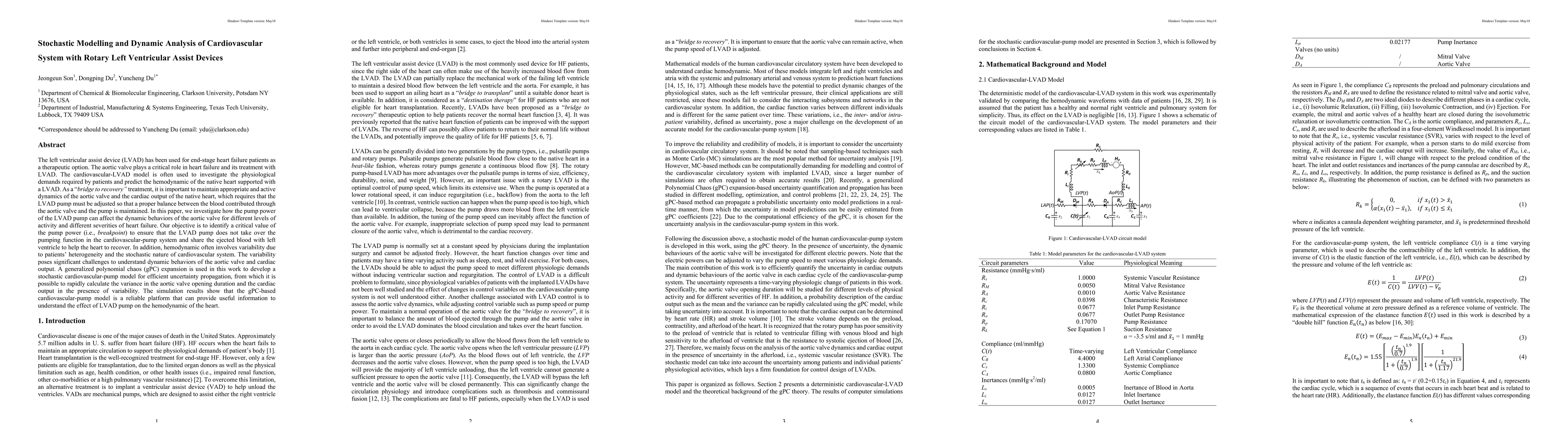 This paper develops a stochastic cardiovascular-LVAD model using generalized polynomial chaos expansion to analyze the dynamic interaction between rotary left ventricular assist devices and the native heart. The study identifies a critical pump power value to balance the LVAD's function with the heart's recovery, highlighting the model's ability to predict variance in aortic valve dynamics and cardiac output amidst patient variability.