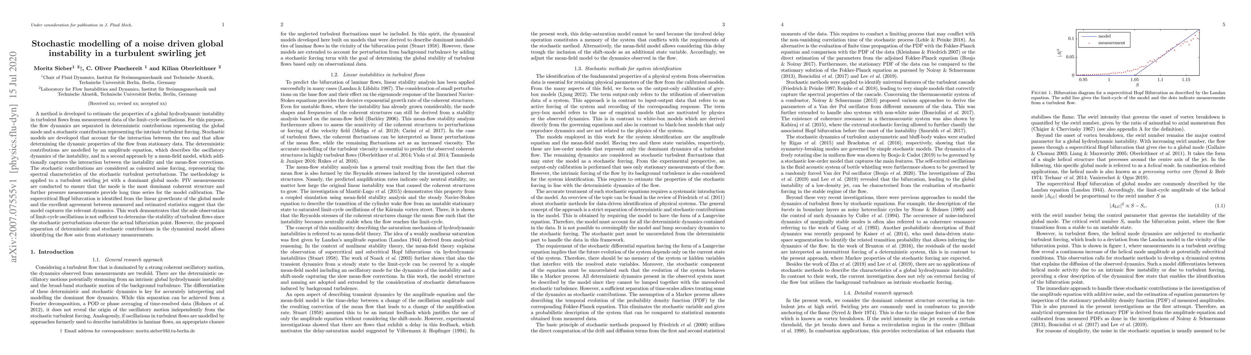 Researchers developed a method to analyze turbulent swirling jet flow instability using limit-cycle oscillations, capturing global hydrodynamic dynamics and stochastic perturbations through a novel separation of deterministic and stochastic contributions.