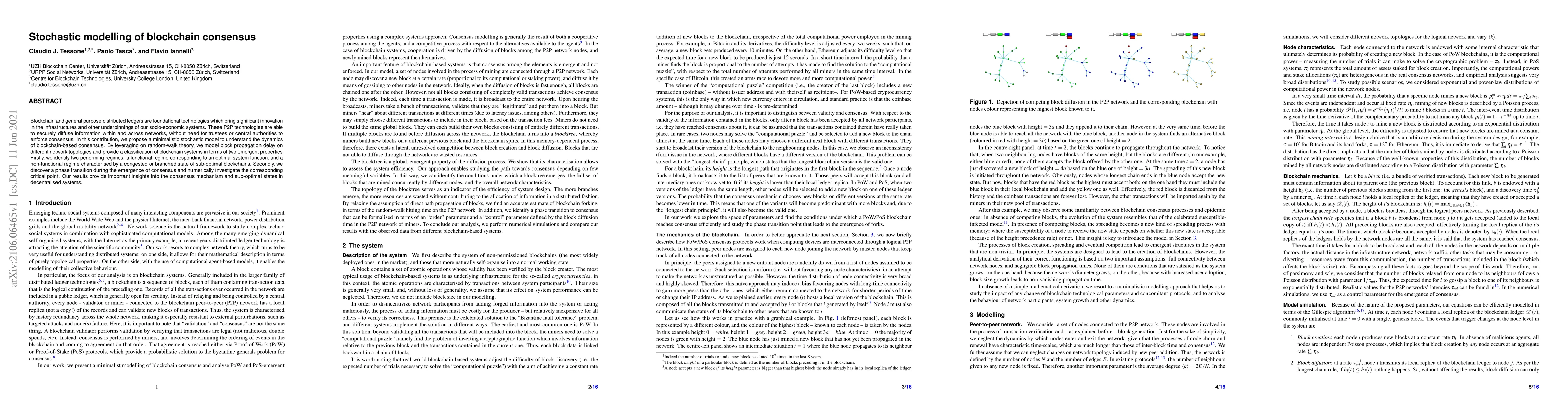 Blockchain and general purpose distributed ledgers are foundational technologies which bring significant innovation in the infrastructures and other underpinnings of our socio-economic systems. These P2P technologies are able to securely diffuse information within and across networks, without need for trustees or central authorities to enforce consensus. In this contribution, we propose a minimalistic stochastic model to understand the dynamics of blockchain-based consensus. By leveraging on random-walk theory, we model block propagation delay on different network topologies and provide a classification of blockchain systems in terms of two emergent properties. Firstly, we identify two performing regimes: a functional regime corresponding to an optimal system function; and a non-functional regime characterised by a congested or branched state of sub-optimal blockchains. Secondly, we discover a phase transition during the emergence of consensus and numerically investigate the corresponding critical point. Our results provide important insights into the consensus mechanism and sub-optimal states in decentralised systems.