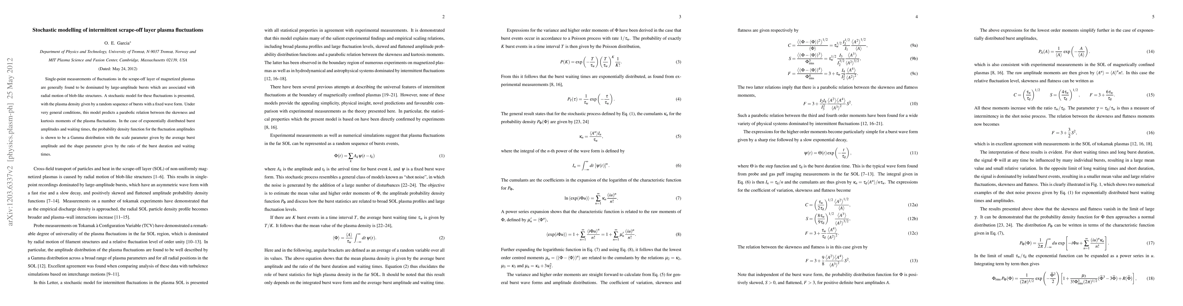 This paper presents a stochastic model for plasma density fluctuations in the scrape-off layer, characterized by large-amplitude bursts. The model predicts a parabolic relation between skewness and kurtosis, and for exponentially distributed burst amplitudes and waiting times, the fluctuation amplitudes follow a Gamma distribution.