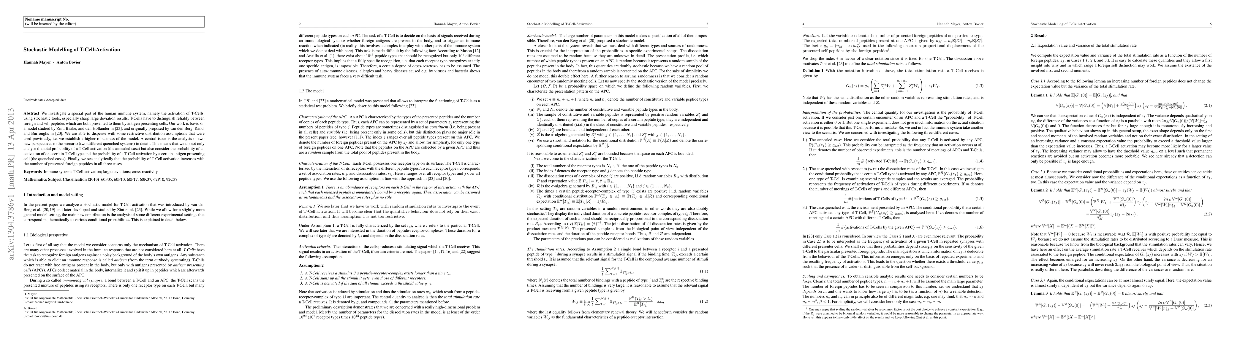 The research employs stochastic modeling tools, specifically sharp large deviation results, to investigate T-cell activation, building upon previous models by Zint, Baake, and den Hollander, and originally proposed by van den Berg, Rand, and Burroughs.