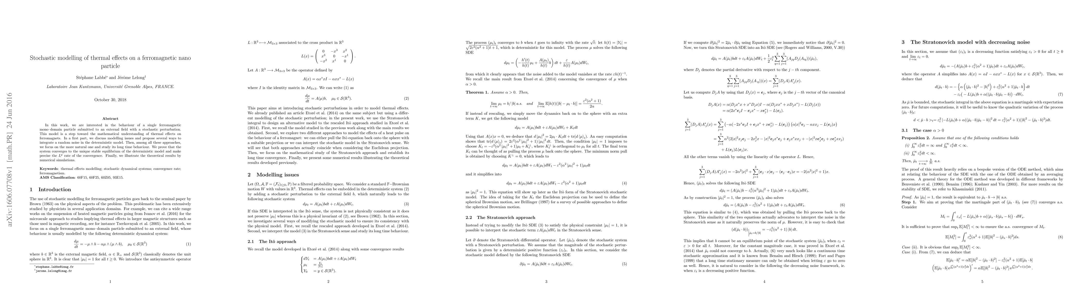 In this work, we are interested in the behaviour of a single ferromagnetic mono--domain particle submitted to an external field with a stochastic perturbation. This model is a step toward the mathematical understanding of thermal effects on ferromagnets. In a first part, we discuss modelling issues and propose several ways to integrate a random noise in the deterministic model. Then, among all these approaches, we focus on the more natural one and study its long time behaviour. We prove that the system converges to the unique stable equilibrium of the deterministic model and make precise the L^p rate of the convergence. Finally, we illustrate the theoretical results by numerical simulations.
