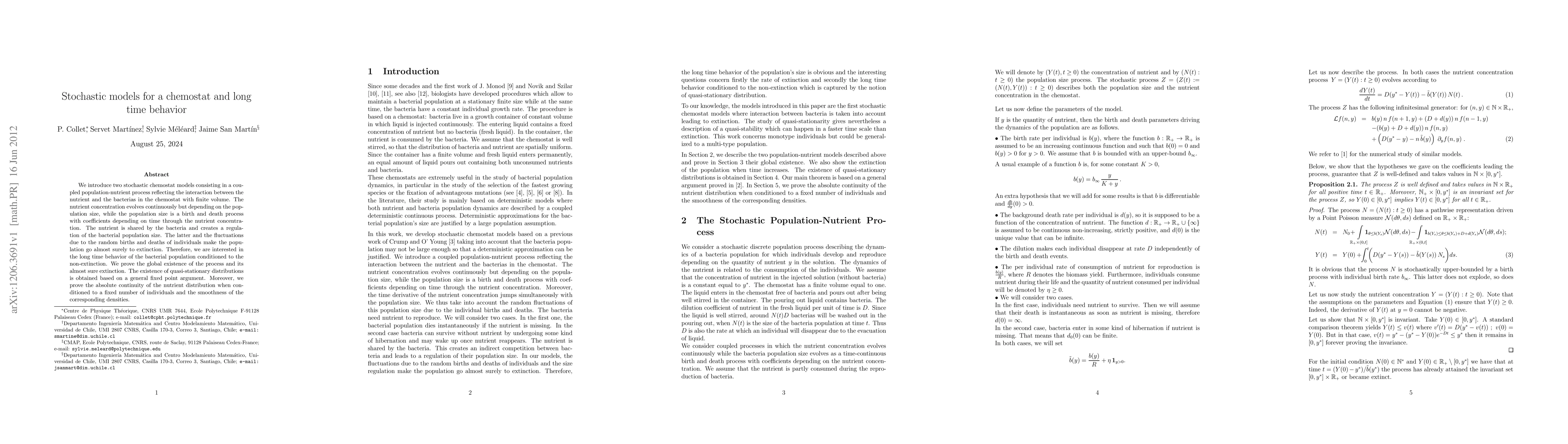 We introduce two stochastic chemostat models consisting in a coupled population-nutrient process reflecting the interaction between the nutrient and the bacterias in the chemostat with finite volume. The nutrient concentration evolves continuously but depending on the population size, while the population size is a birth and death process with coefficients depending on time through the nutrient concentration. The nutrient is shared by the bacteria and creates a regulation of the bacterial population size. The latter and the fluctuations due to the random births and deaths of individuals make the population go almost surely to extinction. Therefore, we are interested in the long time behavior of the bacterial population conditioned to the non-extinction. We prove the global existence of the process and its almost sure extinction. The existence of quasi-stationary distributions is obtained based on a general fixed point argument. Moreover, we prove the absolute continuity of the nutrient distribution when conditioned to a fixed number of individuals and the smoothness of the corresponding densities.