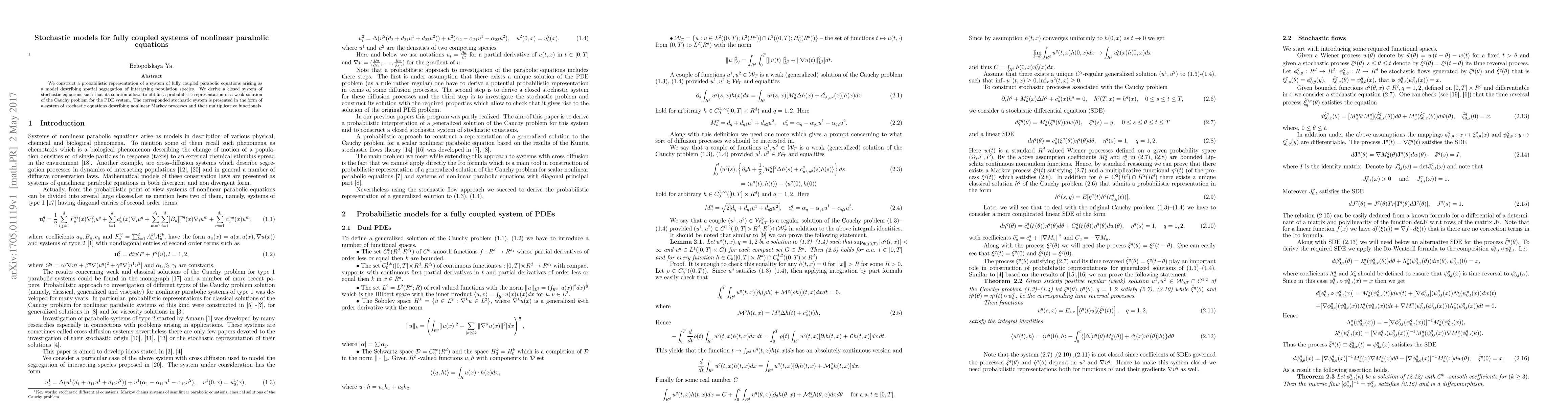 This research derives stochastic models to represent a system of nonlinear parabolic equations modeling species spatial segregation. It presents a closed system of stochastic equations offering a probabilistic interpretation of the PDE system's weak solution.