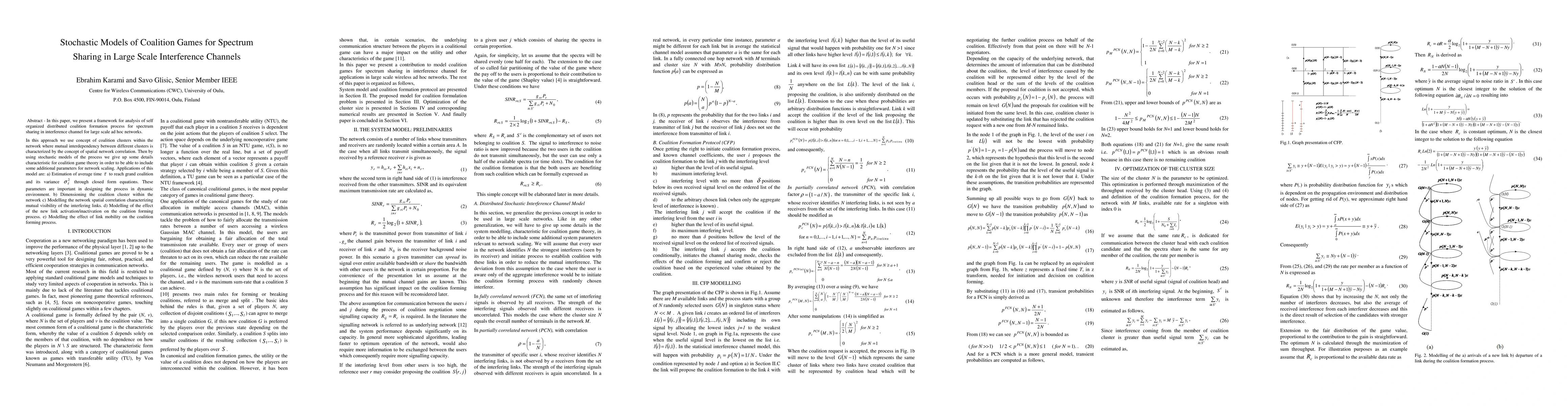 In this paper, we present a framework for the analysis of self-organized distributed coalition formation process for spectrum sharing in interference channel for large-scale ad hoc networks. In this approach, we use the concept of coalition clusters within the network where mutual interdependency between different clusters is characterized by the concept of spatial network correlation. Then by using stochastic models of the process we give up some details characteristic for coalition game theory in order to be able to include some additional parameters for network scaling. Applications of this model are a) Estimation of average time to reach grand coalition and its variance through closed-form equations. These parameters are important in designing the process in a dynamic environment. b) Dimensioning the coalition cluster within the network c) Modelling the network spatial correlation characterizing mutual visibility of the interfering links. d) Modeling of the effect of the new link activation/inactivation on the coalition forming process. e) Modeling the effect of link mobility on the coalition-forming process.