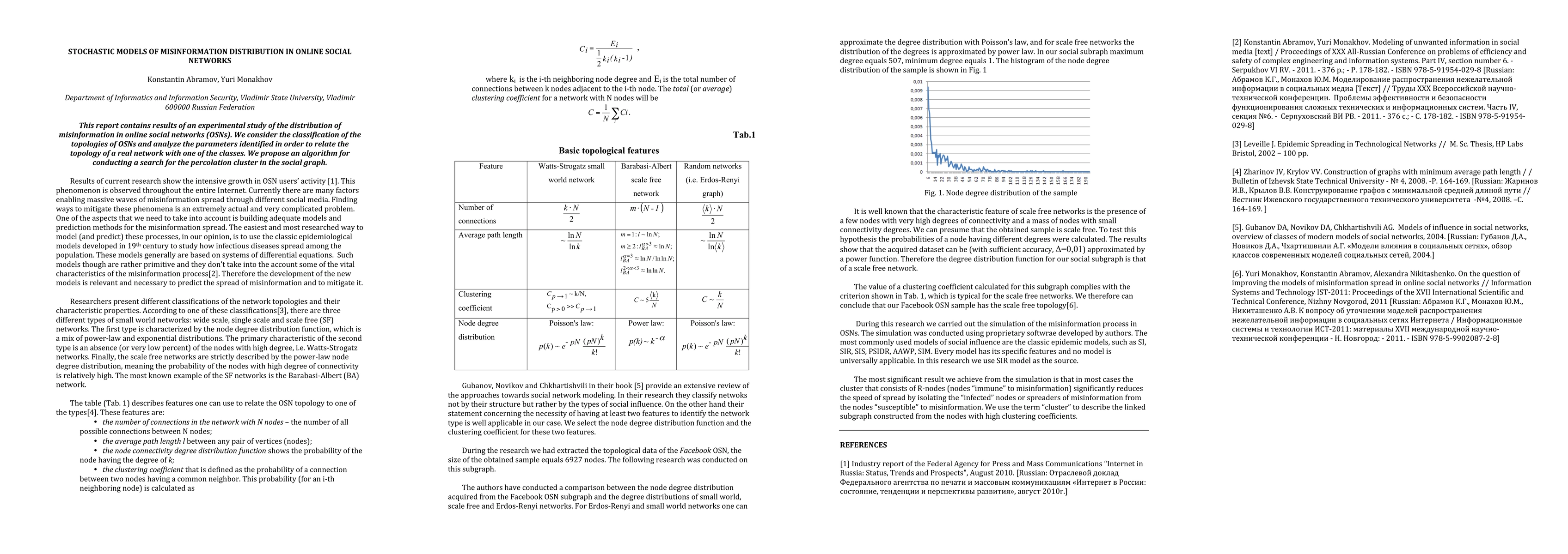 This report contains results of an experimental study of the distribution of misinformation in online social networks (OSNs). We consider the classification of the topologies of OSNs and analyze the parameters identified in order to relate the topology of a real network with one of the classes. We propose an algorithm for conducting a search for the percolation cluster in the social graph.