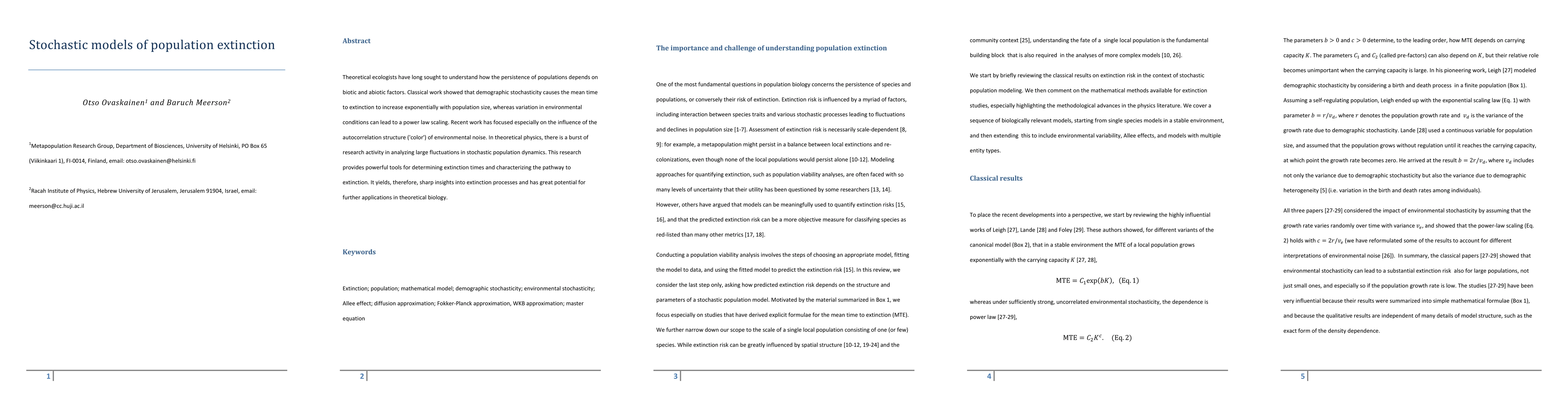 Theoretical ecologists have long sought to understand how the persistence of populations depends on biotic and abiotic factors. Classical work showed that demographic stochasticity causes the mean time to extinction to increase exponentially with population size, whereas variation in environmental conditions can lead to a power law scaling. Recent work has focused especially on the influence of the autocorrelation structure ("color") of environmental noise. In theoretical physics, there is a burst of research activity in analyzing large fluctuations in stochastic population dynamics. This research provides powerful tools for determining extinction times and characterizing the pathway to extinction. It yields, therefore, sharp insights into extinction processes and has great potential for further applications in theoretical biology.